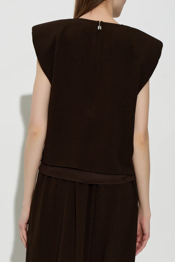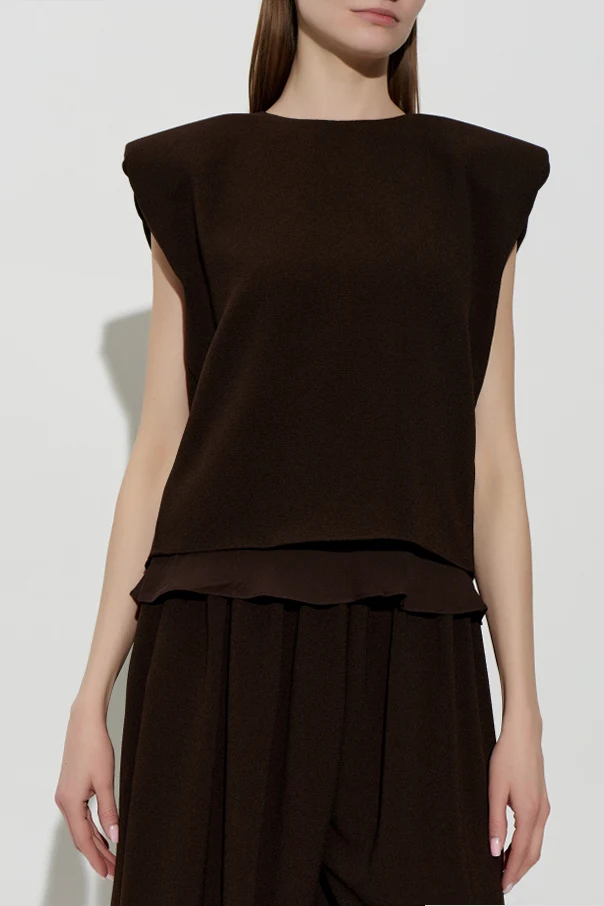 Top z wszytymi poduszkami na ramionach marki ROTATE to manifestacja nowoczesnej elegancji, w której wyrazisty, geometryczny kształt spotyka się z ponadczasową szlachetnością koloru brązowego. Charakterystyczna, pudełkowa linia ramion została zdefiniowana dzięki perfekcyjnie wszytym poduszkom, tworząc niezwykle modny, strukturalny efekt o bezkompromisowym wyrazie.