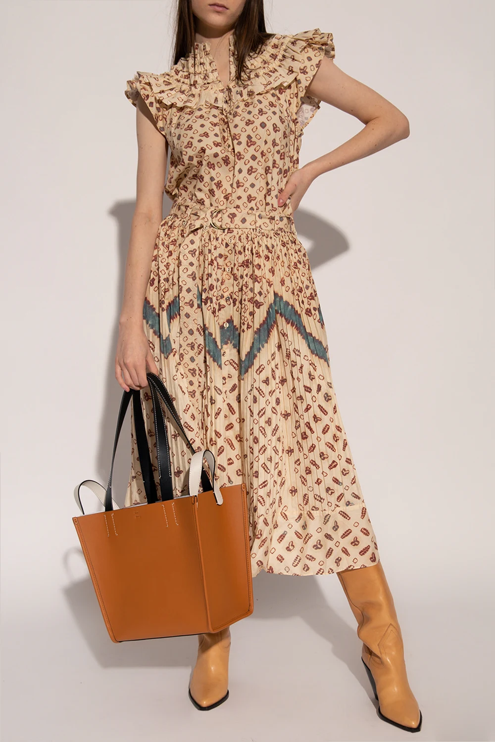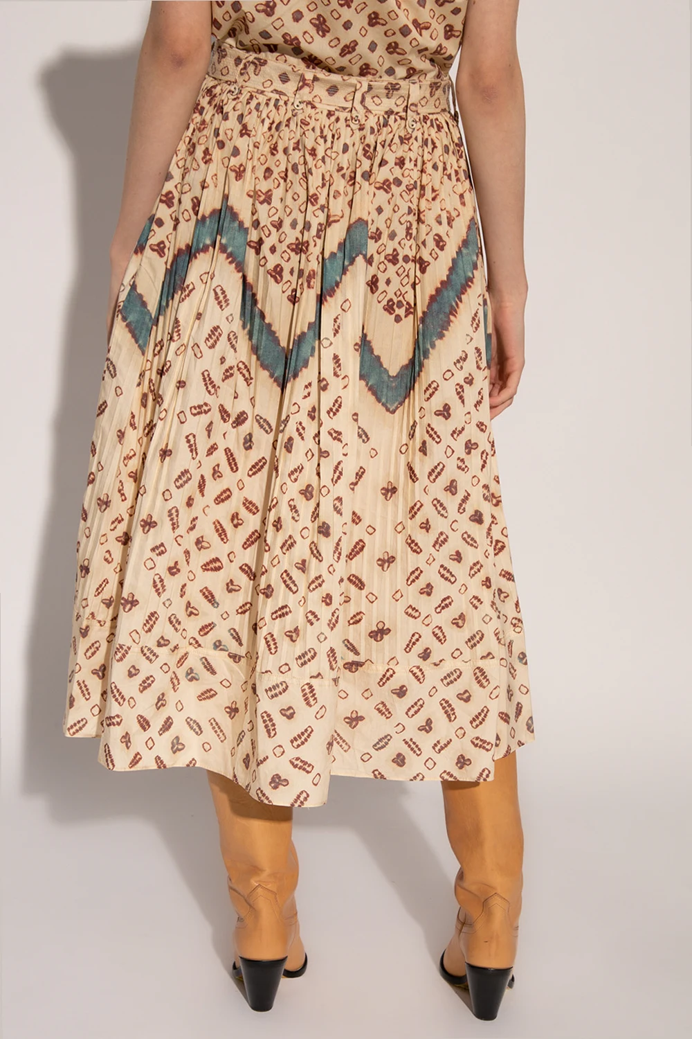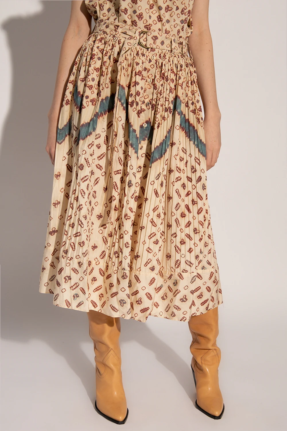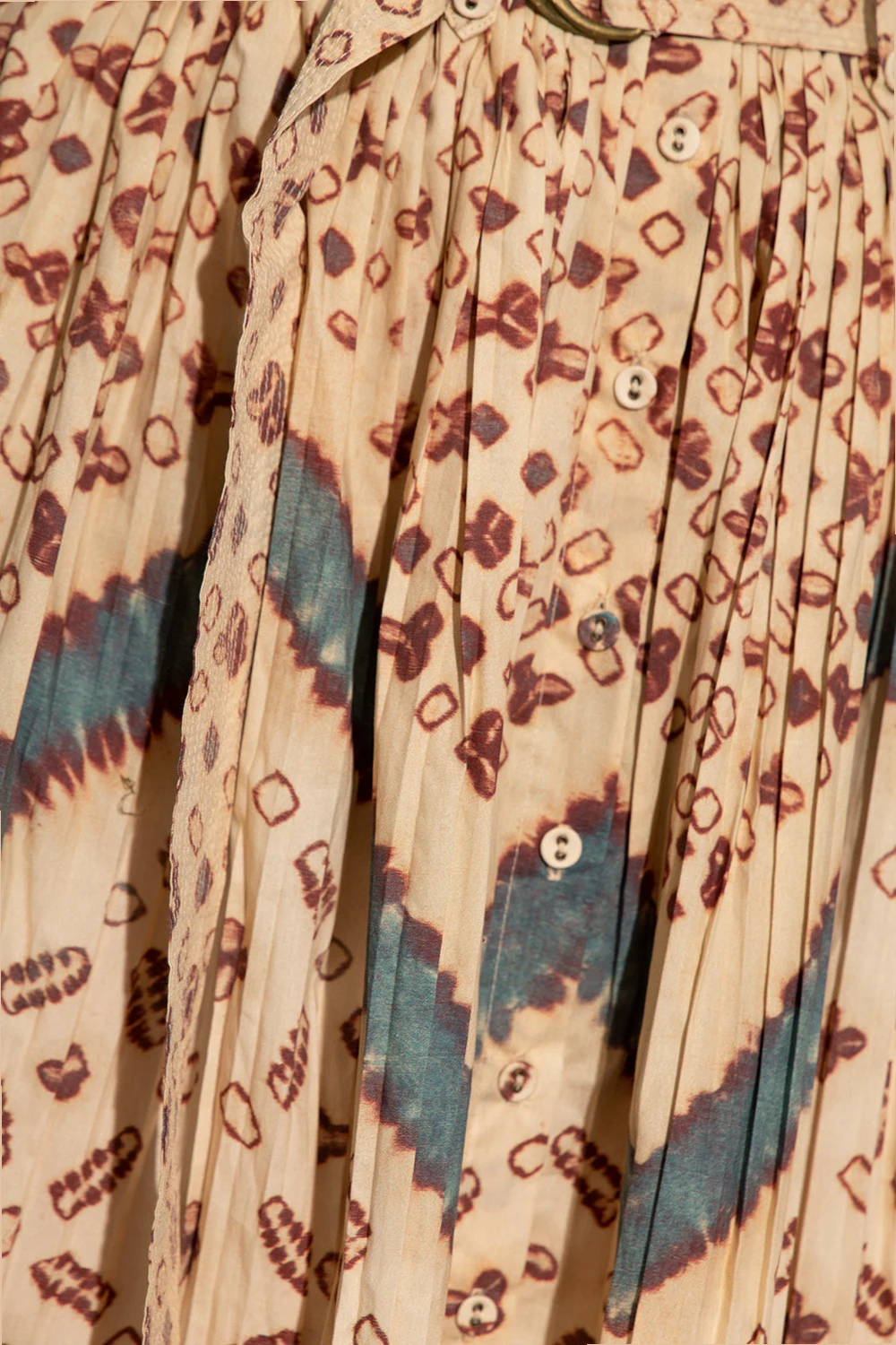 Beżowa, plisowana spódnica, model ‘Alejandra’ Ulla Johnson. Wykonana z bawełny. Z przodu zapinana na guziki. Ozdobiona brązowo-niebieskozielonym wzorem. Dołączony materiałowy pasek z klamrą. Dwie wsuwane kieszenie.