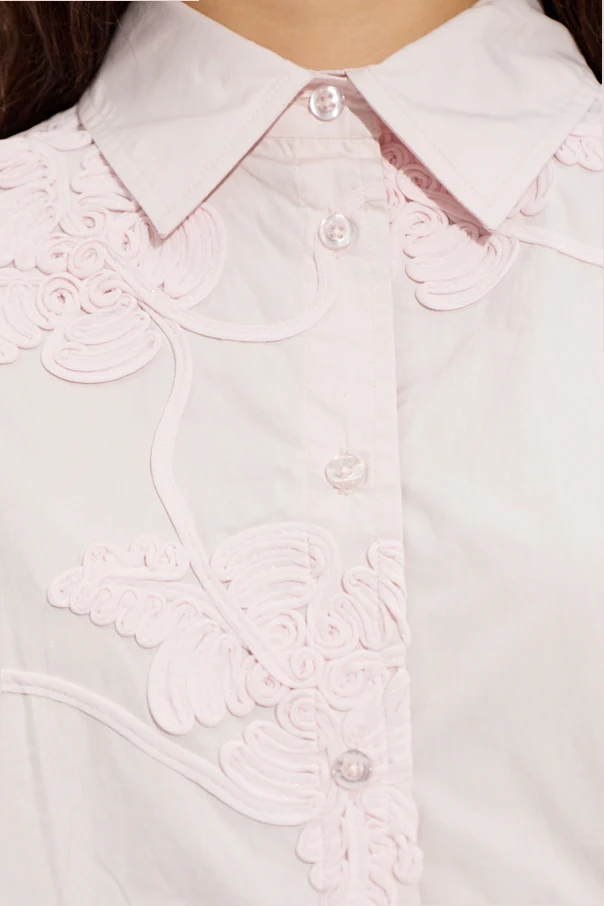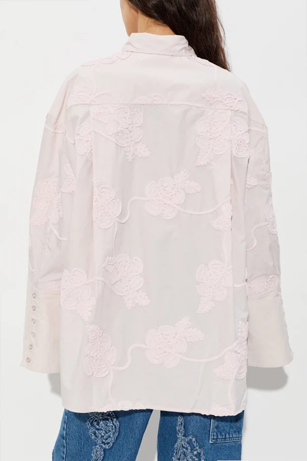 Wyrafinowana koszula o kroju oversize od marki ROTATE to połączenie subtelnej elegancji i skandynawskiej fantazji. Wyróżnia się wydłużoną linią ramion , szerokimi rękawami oraz niezwykle efektownym, trójwymiarowym wzorem kwiatowym, w formie wypukłych aplikacji zdobiących zarówno przód, jak i tył koszuli.