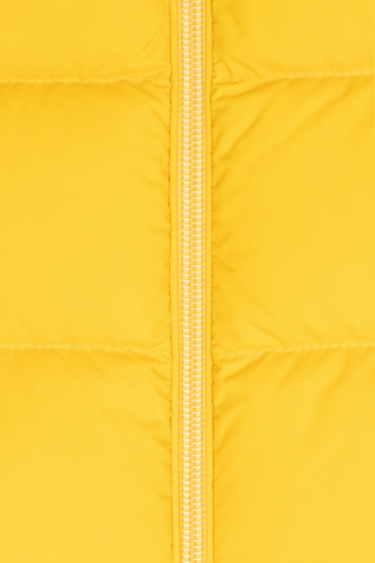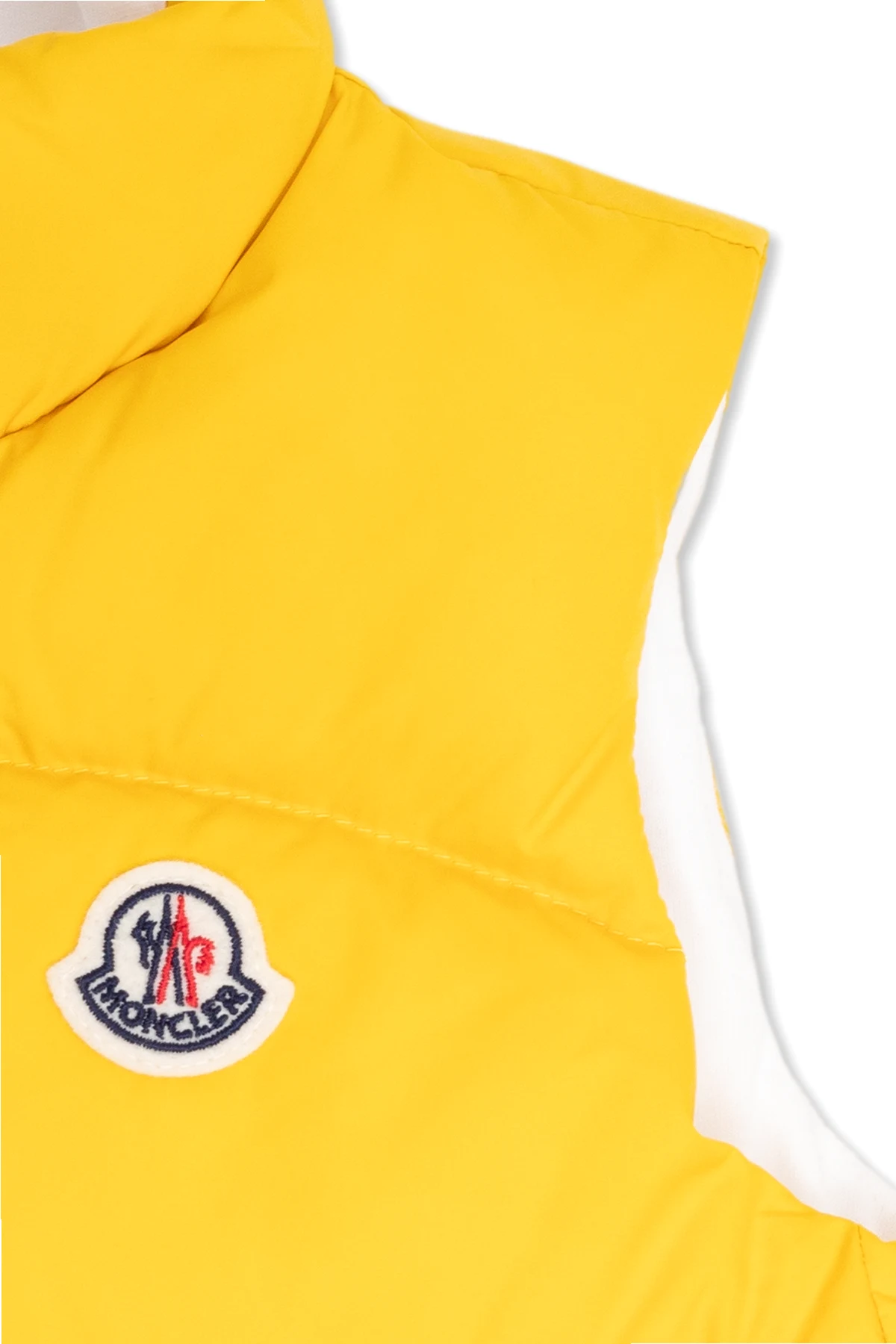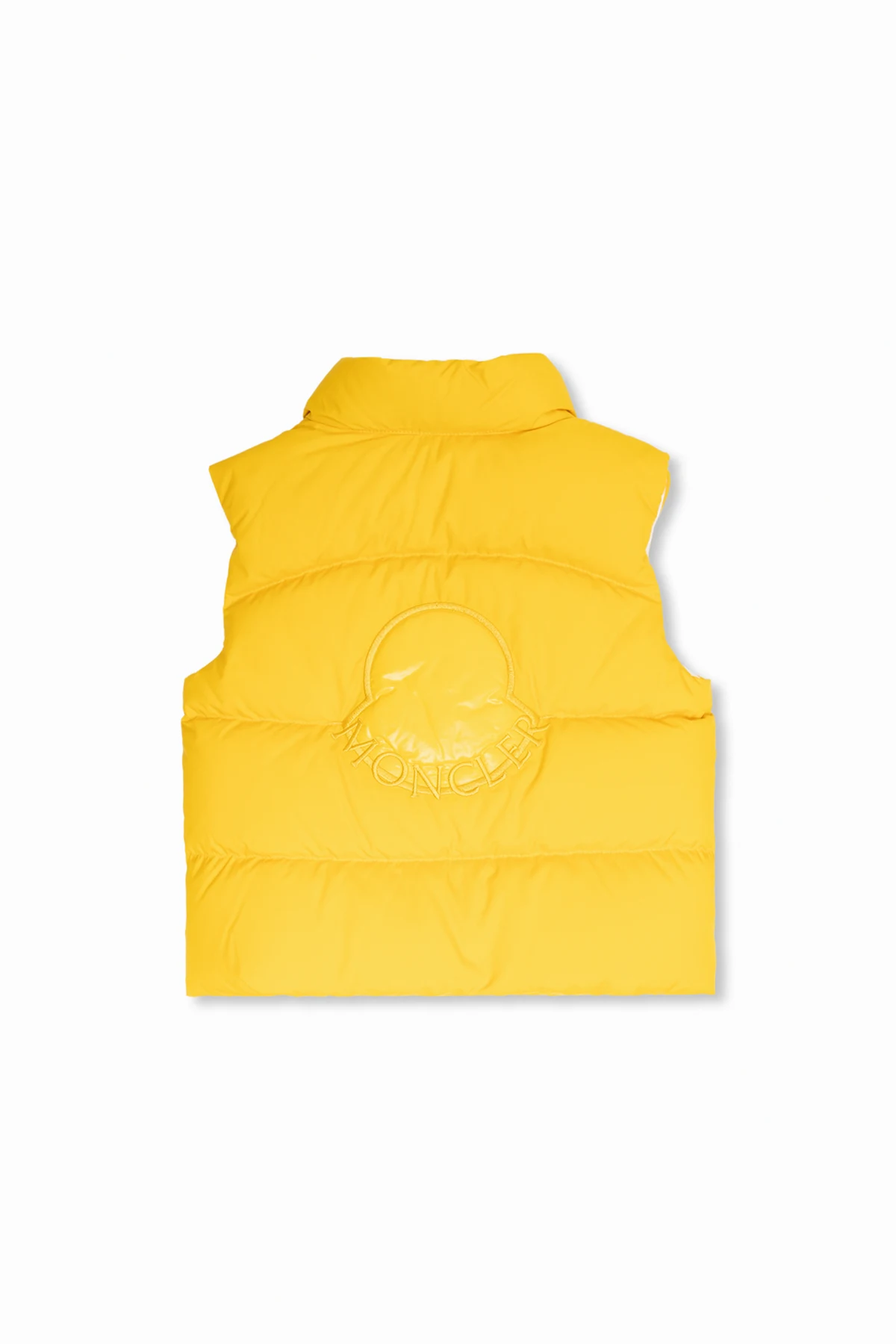 Żółta, puchowa kamizelka, model 'Lida' Moncler Enfant. Wykonana z materiałów pochodzących z recyklingu. Zapinana na zamek. Z przodu naszywka z logo, z tyłu haft z logo.