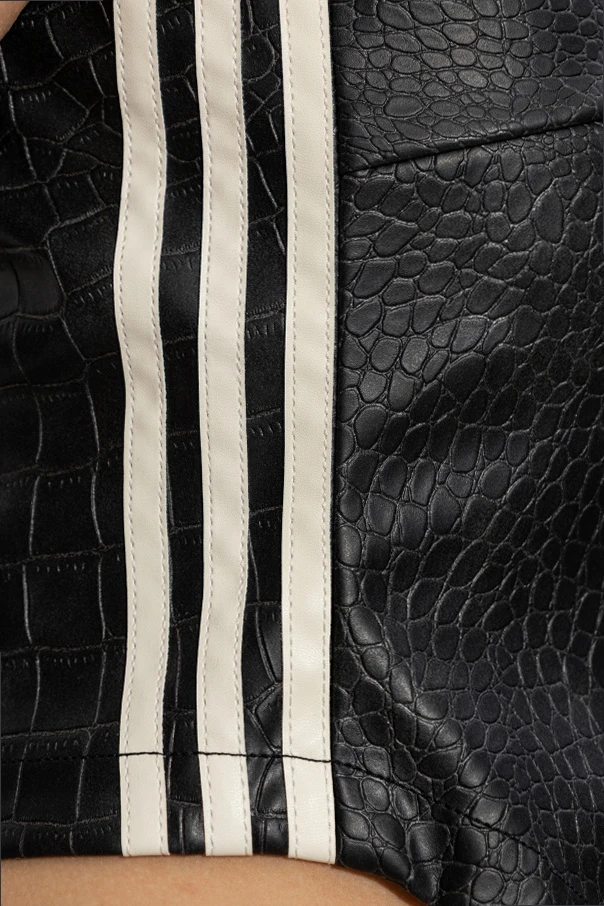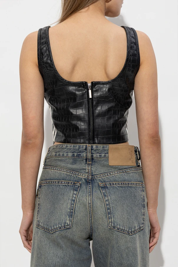Starannie wykonany z materiału o czarnym, połyskującym wykończeniu , imitującego skórę z tłoczonym wzorem skóry krokodyla lub węża, top ten zachwyca luksusowym charakterem. Wnętrze wyściełane miękkim materiałem zapewnia wyjątkowy komfort noszenia. Charakteru całości dodają trzy kontrastowe, białe paski po bokach oraz centralnie umieszczone, subtelne tłoczone logo projektanta.