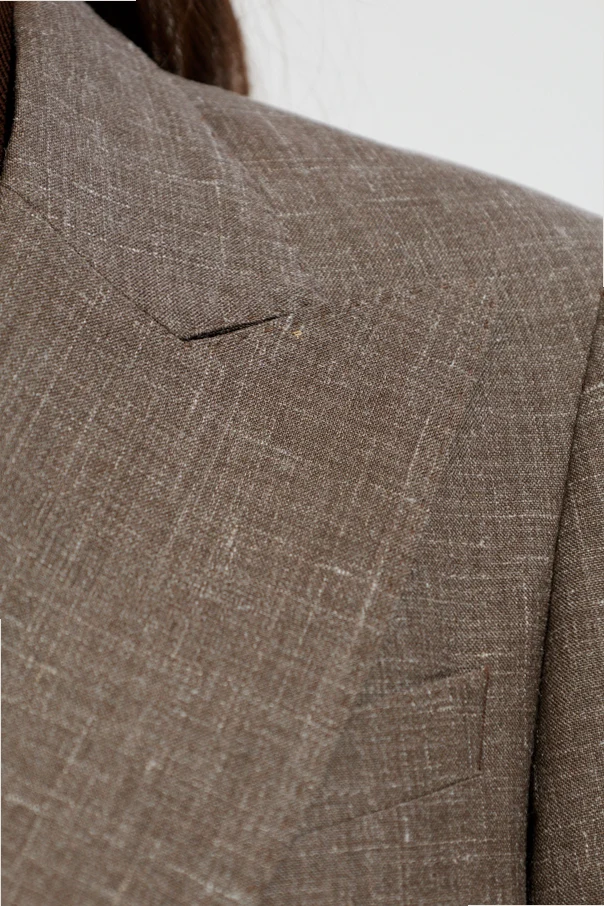 Wełniana marynarka „Sandra” marki Officine Generale to kwintesencja ponadczasowej elegancji, stworzona dla kobiet ceniących wyrafinowanie oraz styl. Klasyczny, dwurzędowy fason został delikatnie wydłużony, by podkreślić sylwetkę i nadać marynarce wyjątkowej szlachetności. Ciepły, brązowy odcień tkaniny, wykonanej z połączenia wysokogatunkowej wełny, jedwabiu oraz lnu, zachwyca wyszukaną strukturą i ponadczasowym melanżem.