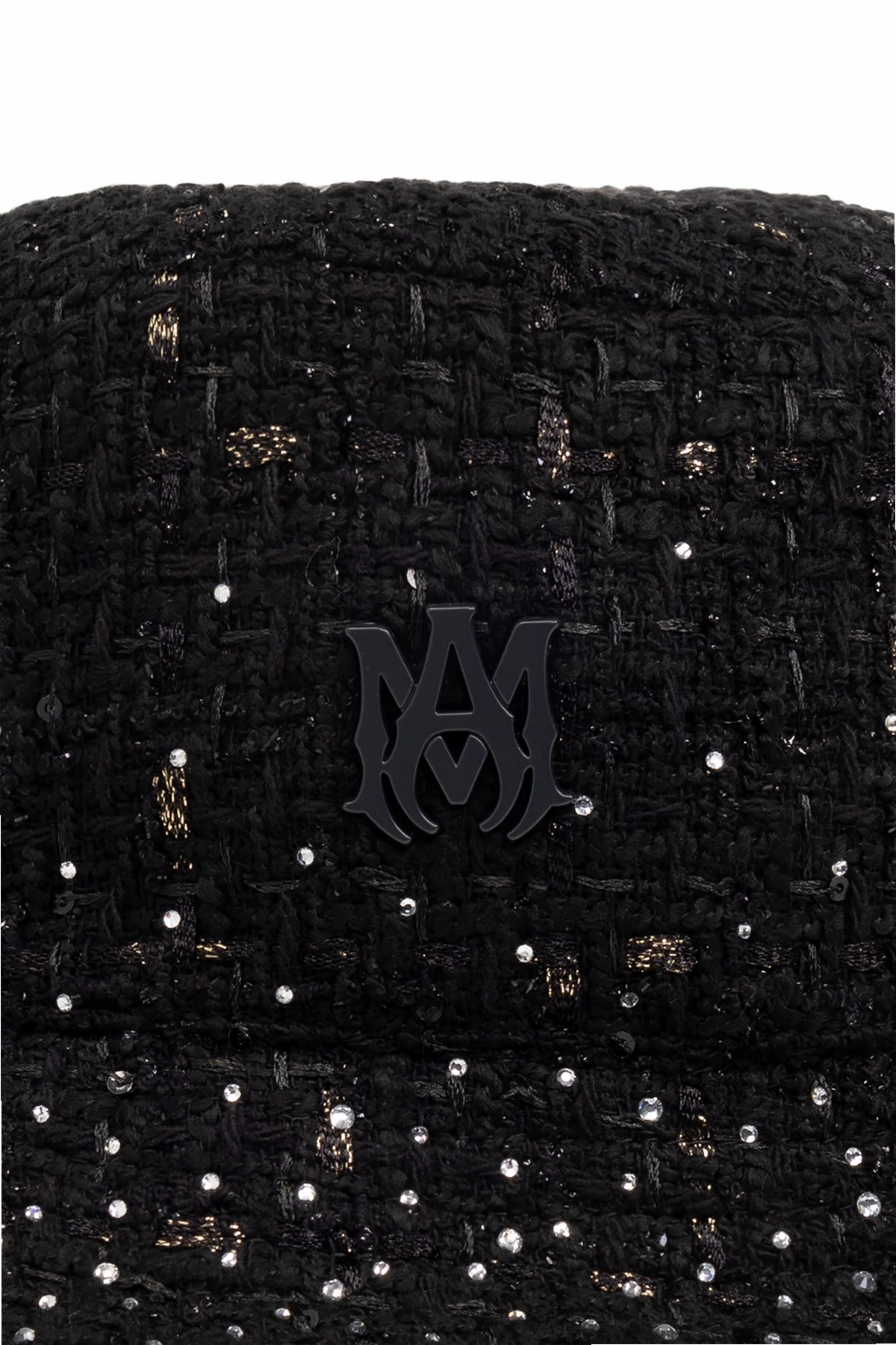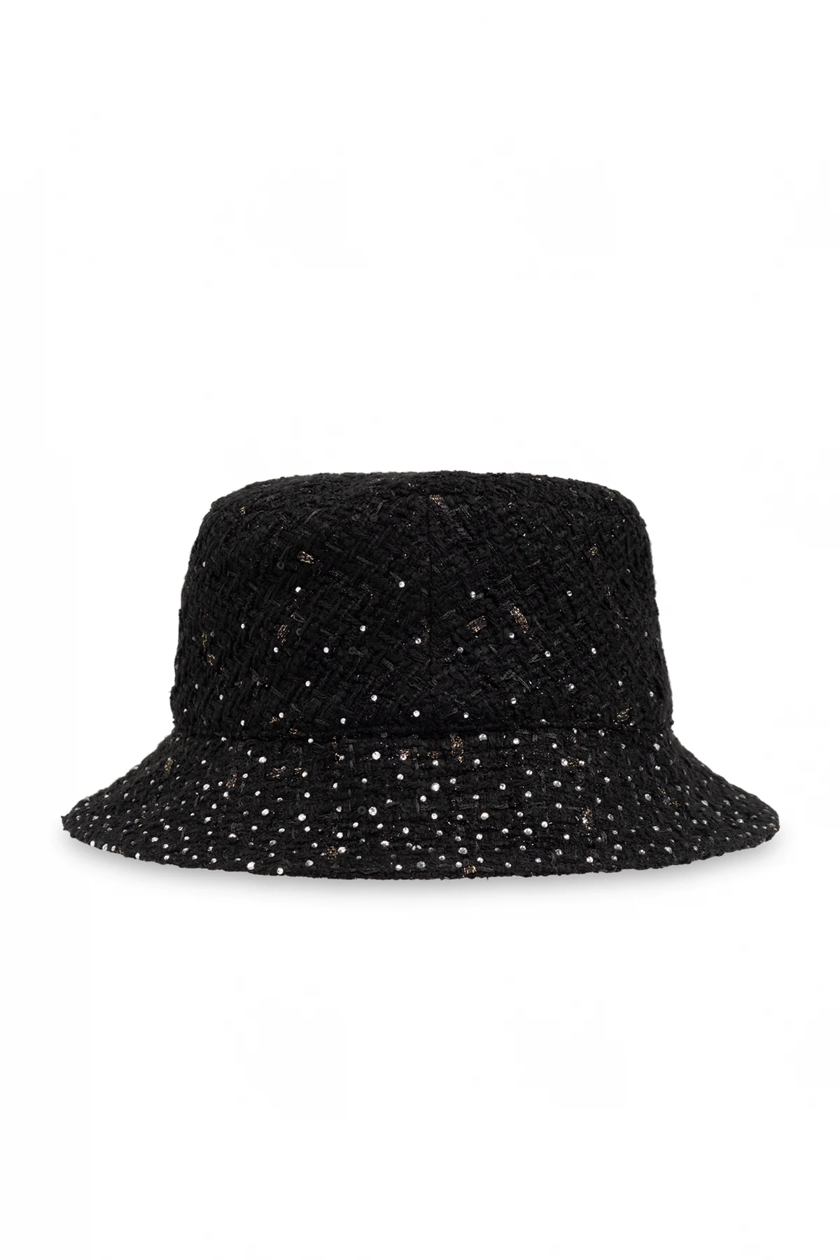 Kapelusz ozdobiony jest drobnymi, lśniącymi akcentami, które mogą być koralikami lub cekinami, dodającymi blasku każdej stylizacji. Charakterystyczne, miękkie brzegi typowe dla stylu ‘bucket’ opadają lekko na wszystkie strony, co zapewnia modny wygląd. Logo projektanta, wykonane z metalicznego materiału, umieszczone na przodzie kapelusza, stanowi wyraźny element identyfikujący markę i dodaje produktowi ekskluzywności.