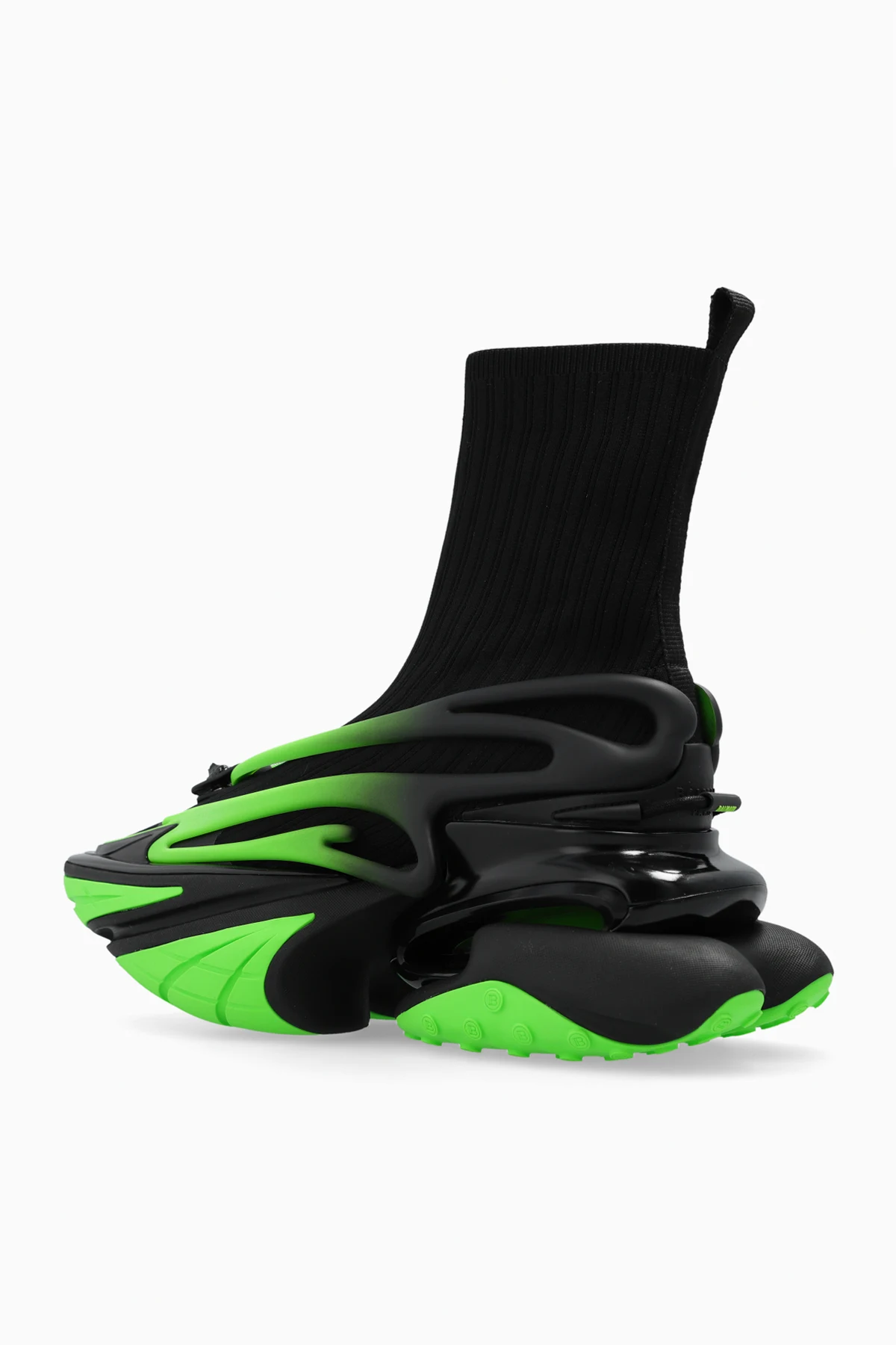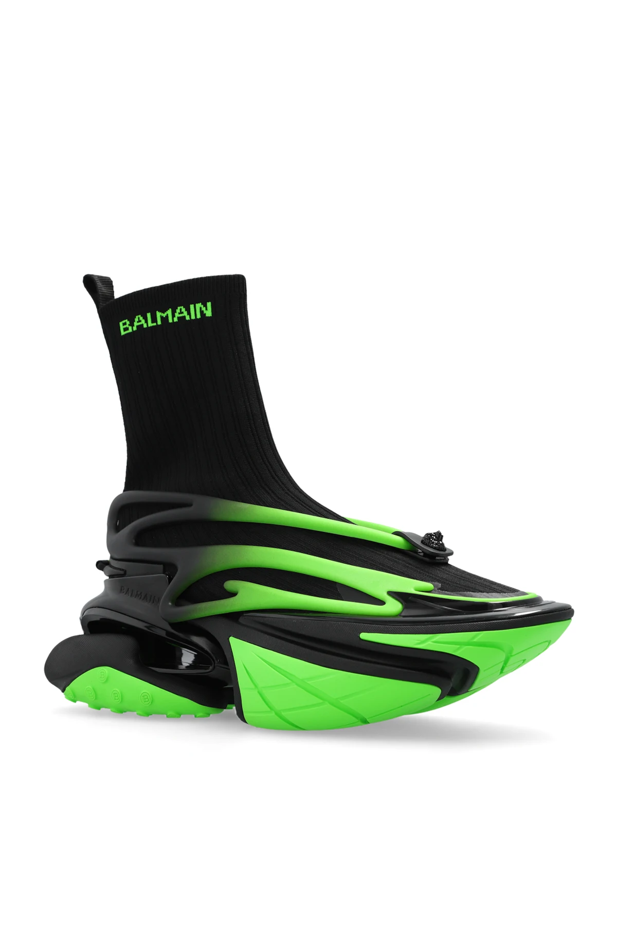 Czarno-zielone, sznurowane buty sportowe za kostkę, model 'Unicorn' Balmain. Wykonane z elastycznej skarpety. Wykończone skórą i gumą. Ozdobione metalową aplikacją z charakterystyczną dla marki głową lwa oraz wyszytym logo. Dekoracyjna, gruba podeszwa z wycięciami. Wykonana z gumy w kolorze zielonym.