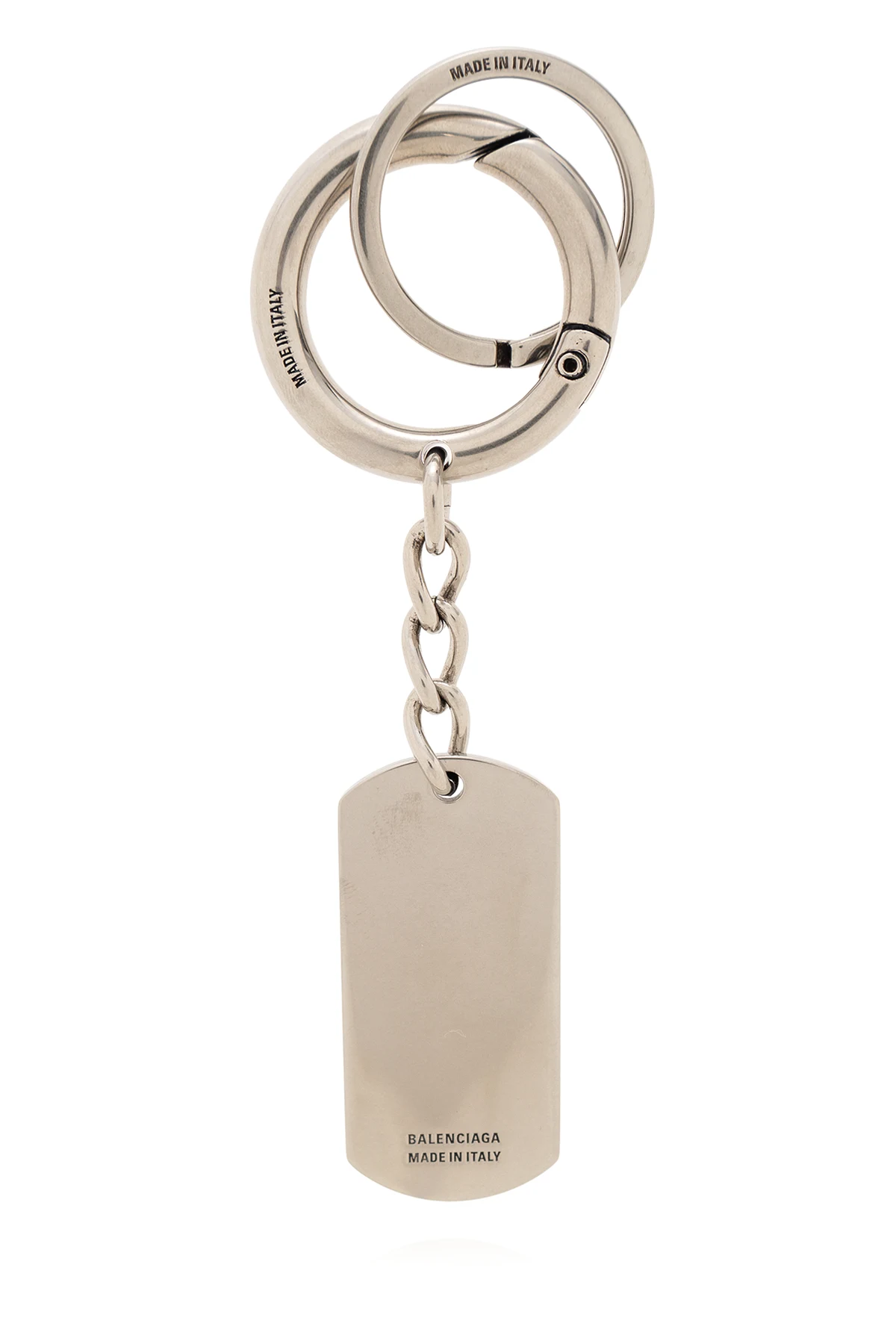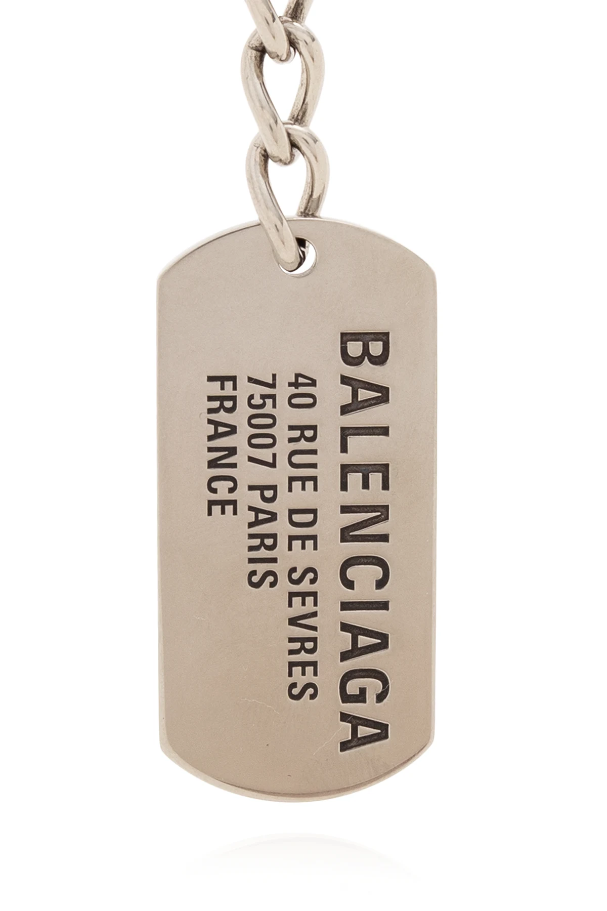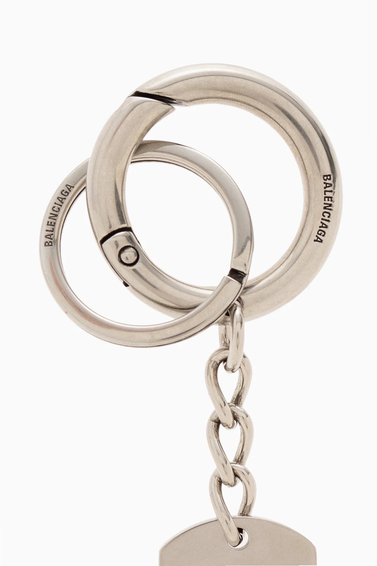 Okrągły karabińczyk w kolorze srebrnym Balenciaga. Wykonany z mieszanki mosiądzu. Ozdobiony zawieszką z wygrawerowanym wzorem z logo.