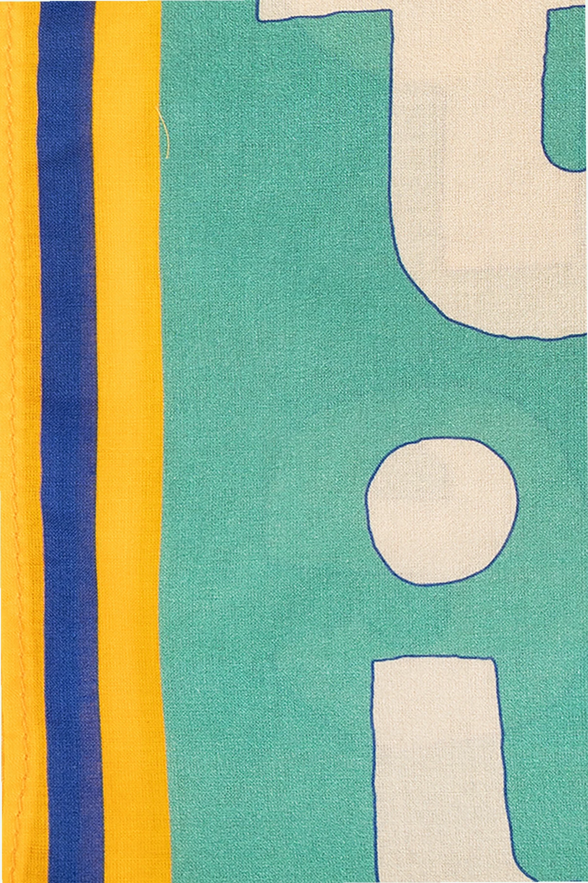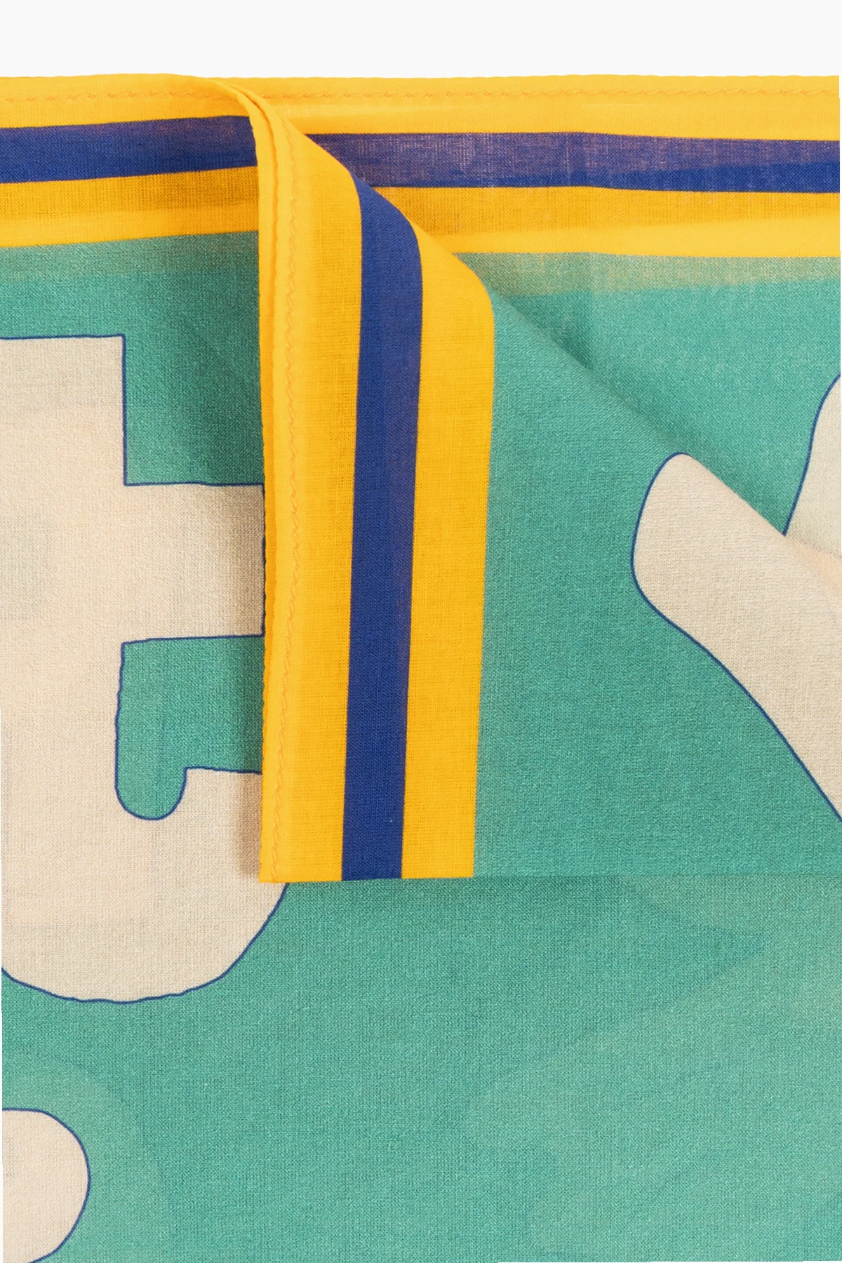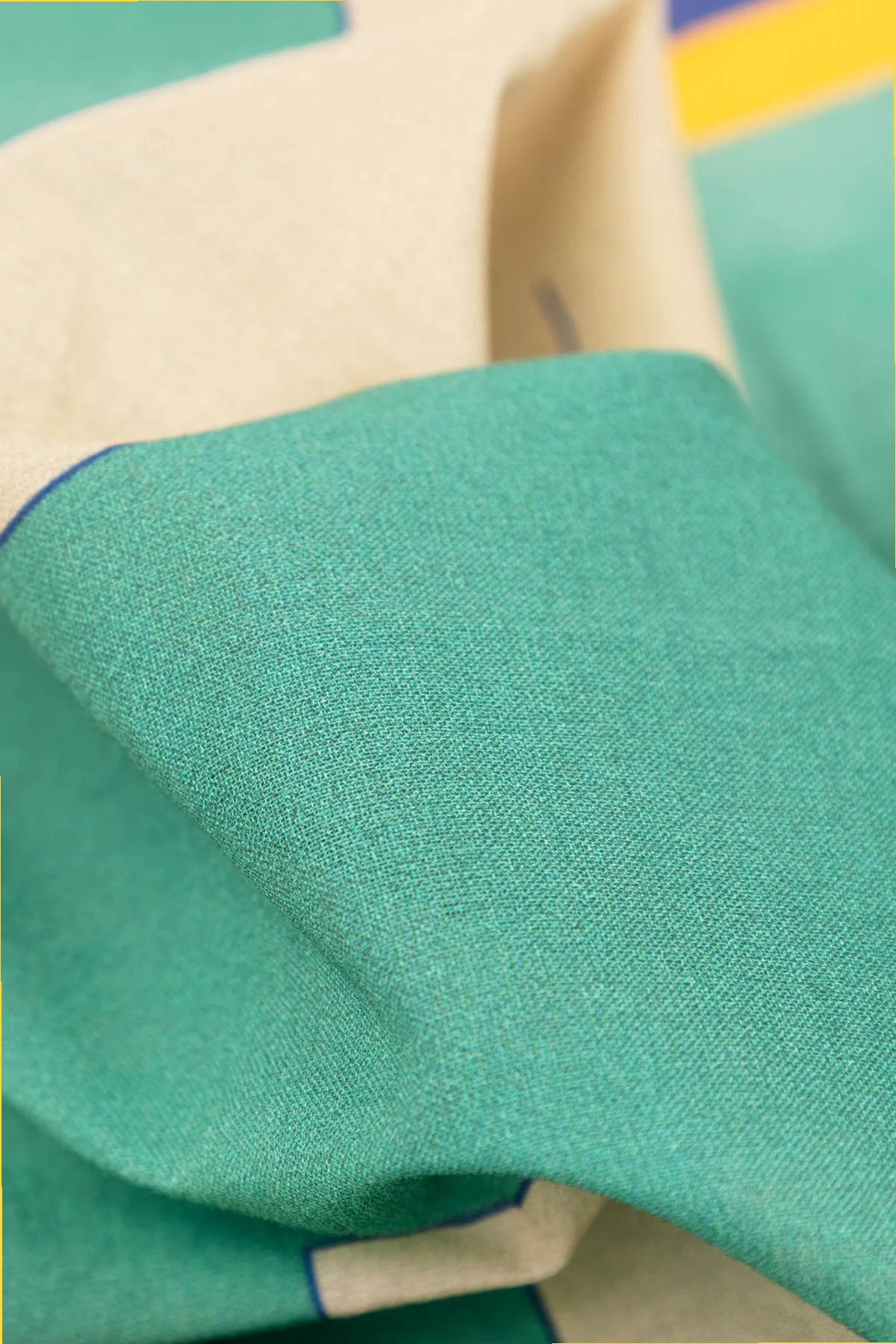 Detal, który dodatkowo podkreśla ekskluzywny charakter produktu, to pasy w kolorach żółtym i granatowym, biegnące wzdłuż krawędzi chusty. Staranność wykonania widoczna jest zarówno w równomiernie rozmieszczonych wzorach, jak i solidnie przyszytych pasach kolorystycznych, co świadczy o niezwykłej dbałości o każdy detal.