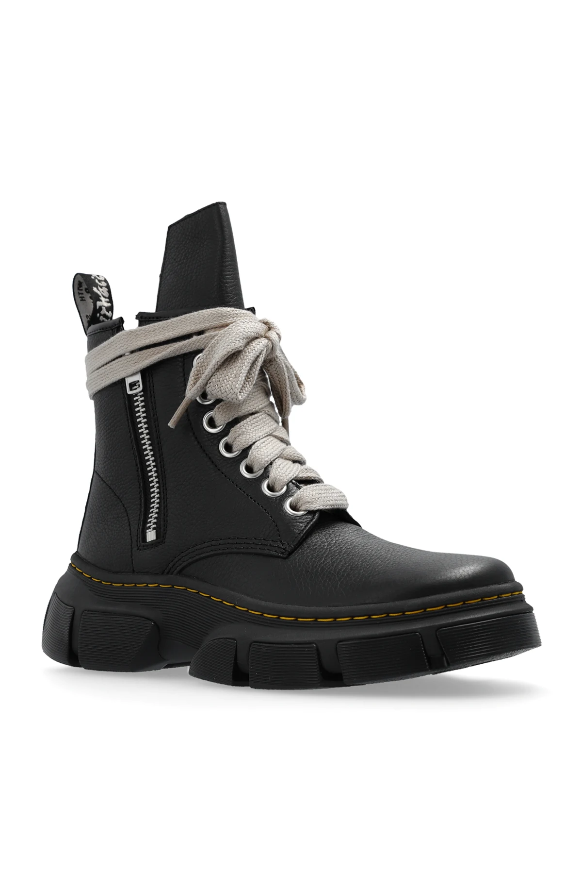 Czarne, sznurowane buty za kostkę Rick Owens x Dr. Martens. Wykonane ze skóry. Z boku zapięcie na zamek. Zaokrąglony nosek. Z tyłu uchwyt z logo. Czarna, gumowa przeszycia z pomarańczowymi przeszyciami.