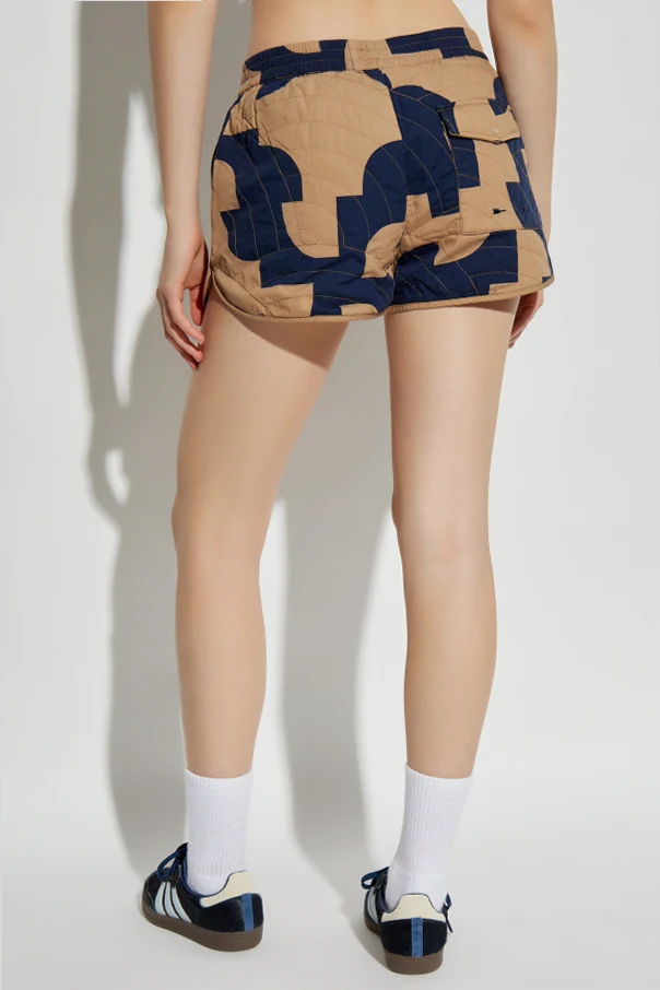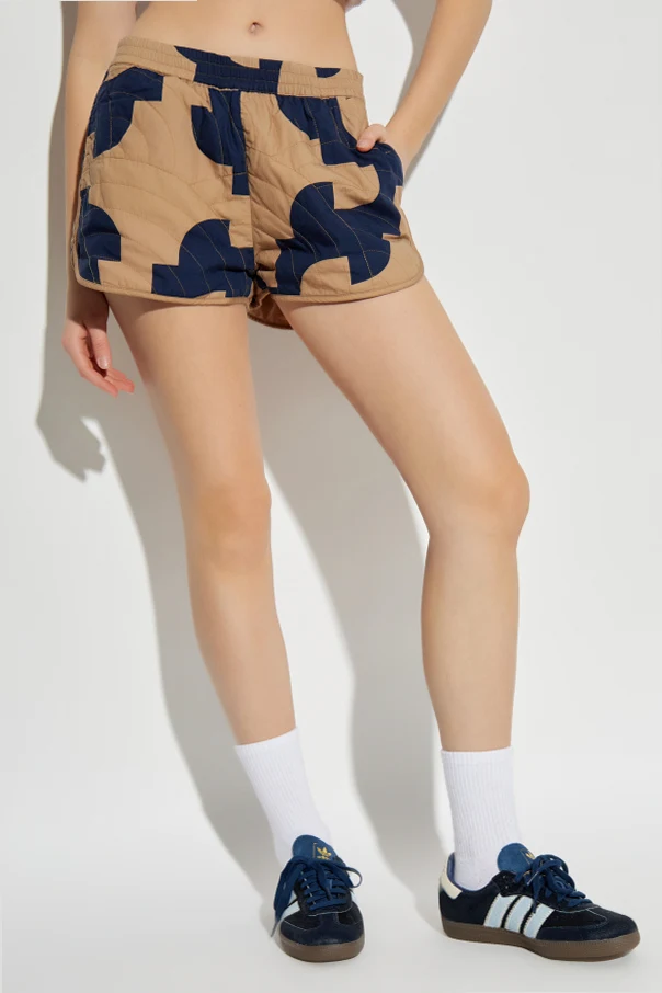 Geometryczny, wyrazisty wzór w ciemnoniebieskich tonach na beżowym tle przyciąga wzrok, dodając kreacji oryginalnego wyrazu. Szorty wykonano z wysokogatunkowej bawełny organicznej, której pikowana, strukturalna powierzchnia podkreśla ekskluzywność oraz praktyczność produktu. Boczne kieszenie oraz subtelne przeszycia dopełniają całości wyrafinowanym detalem, wprowadzając harmonię i lekkość formy.