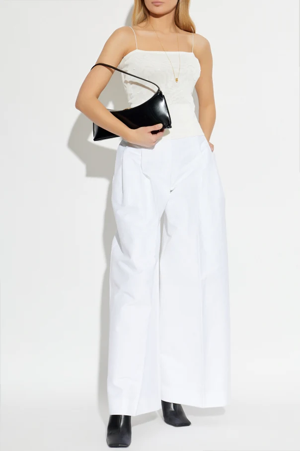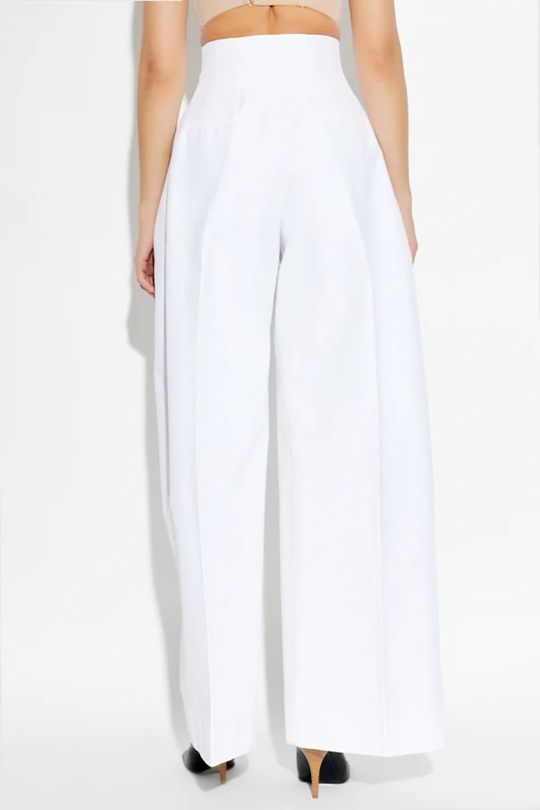 Spodnie z nogawkami o szerokim kroju autorstwa Jacquemus to wyrafinowana propozycja dla osób poszukujących unikatowej elegancji w minimalistycznym wydaniu. Model wyróżnia się wyrazistą, szeroką linią nogawek oraz geometrycznym, prostym krojem, który subtelnie wysmukla i wydłuża sylwetkę dzięki podkreślonej, wysokiej talii.