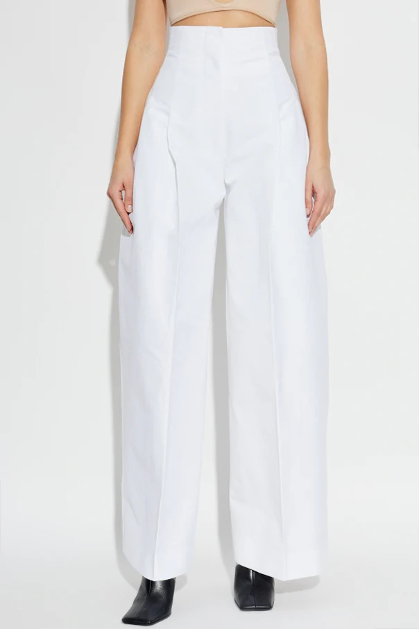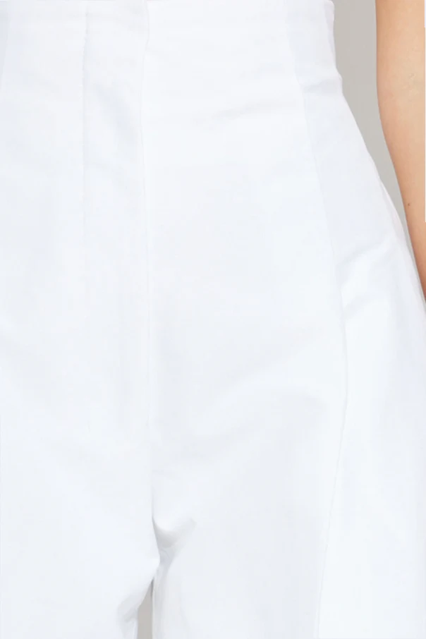 Starannie dobrana, najwyższej jakości bawełna zapewnia lekko sztywną, gładką fakturę materiału, która doskonale utrzymuje formę spodni. Biały kolor podkreśla czystość fasonu i wyrafinowanie projektu, akcentując wyłącznie wyprofilowane zaszewki, subtelne stebnowania oraz wyraziste, czyste linie szycia.
