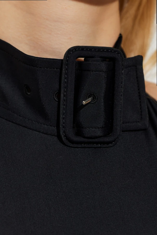 Klasyczny, dopasowany krój z mocno wykrojonymi ramionami oraz wyraźnie odsłoniętymi plecami tworzy wyjątkowo harmonijną linię, nadając sylwetce lekkości. Front pozostaje zabudowany i gładki, a efektowna, wysoka stójka zapinana na dużą klamrę materiałową przyciąga uwagę nowoczesnym akcentem. Brak nadruków i elementów ozdobnych sprawia, że każdy detal ma tu znaczenie.