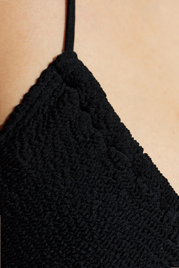 Góra od kostiumu kąpielowego marki Bond-Eye emanuje ponadczasową elegancją i subtelną zmysłowością. Klasyczny, trójkątny fason typu bikini zachwyca minimalistyczną linią, podkreśloną przez cienkie sznurki umożliwiające idealne dopasowanie dzięki regulowanemu wiązaniu na szyi i plecach. Wytworzona z ręcznie wykończonego, strukturalnego, lekko marszczonego materiału, delikatnie przylegającego do ciała, zapewnia niezwykły komfort noszenia oraz doskonałe dopasowanie do sylwetki.