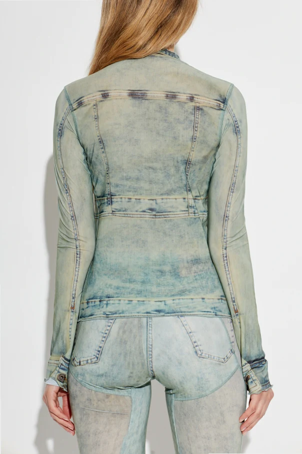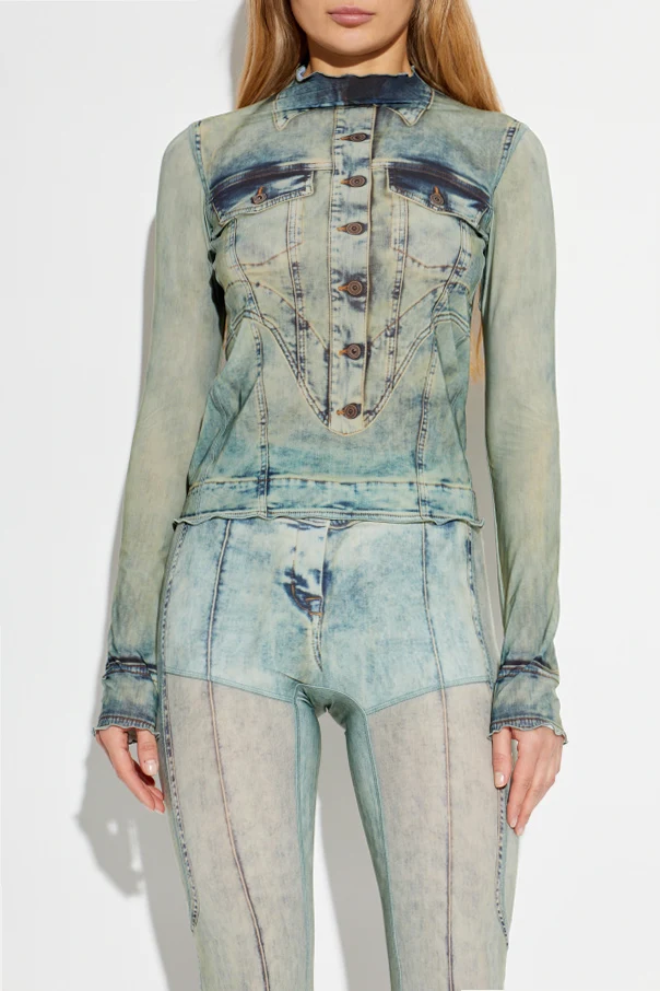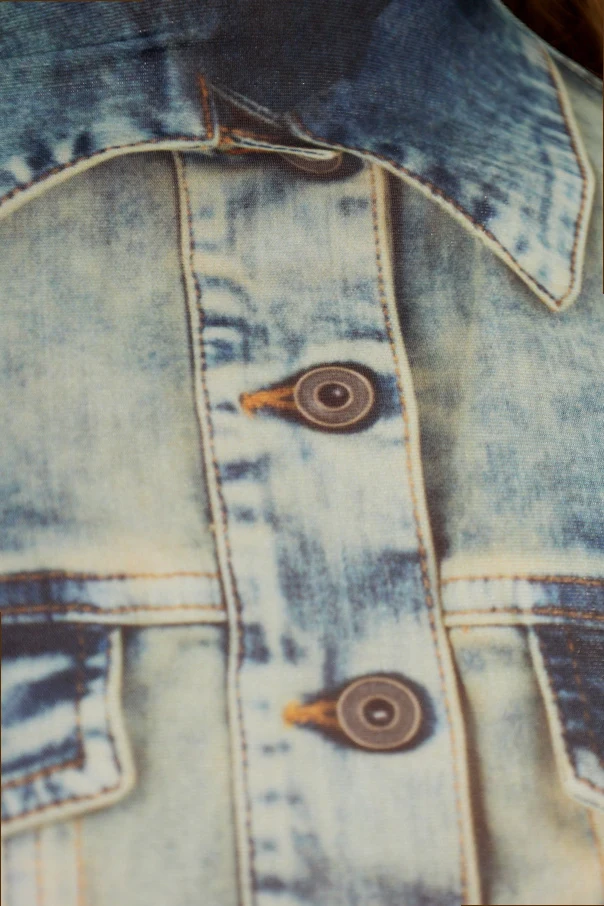 Zastosowano tu lekki, półprzezroczysty materiał, będący wyrafinowanym splotem siateczki oraz elastycznego jerseyu, zapewniający komfort i podkreślający subtelność fasonu. Efektowny nadruk imituje jasnozielono-niebieską, spraną kurtkę jeansową, odwzorowując z najwyższą precyzją przetarcia, przeszycia, guziki oraz kieszenie . To złudzenie optyczne czyni model zjawiskowo unikatowym.