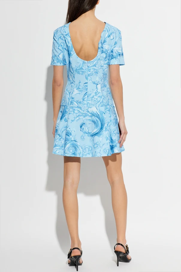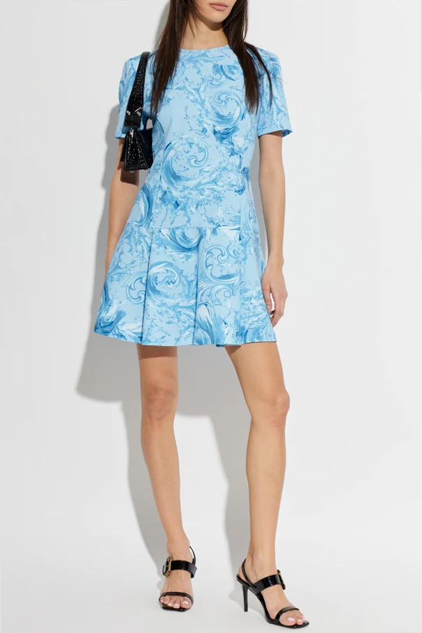 Sukienka ze wzorem barocco marki Versace Jeans Couture to kwintesencja wyrafinowanego stylu, gdzie ponadczasowy charakter przeplata się z nowoczesnością. Ta miniaturowa kreacja o dopasowanej górze oraz lekko rozkloszowanym dole harmonijnie podkreśla sylwetkę.