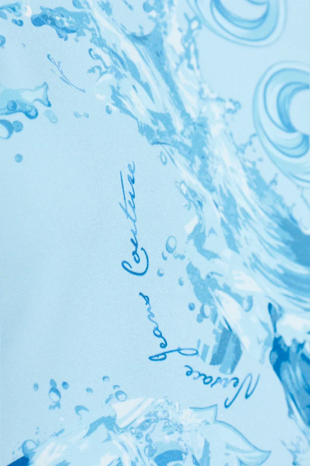 Wzór typu barocco, inspirowany klasycznym barokiem, przyciąga wzrok ornamentalnymi, falistymi motywami. Niebieski kolor nadaje sukience wyjątkowej głębi, a subtelne logo projektanta wkomponowane w print dyskretnie podkreśla ekskluzywność kolekcji. Głęboki, półokrągły dekolt na plecach oraz krótkie rękawy dodają wyrafinowanej lekkości, natomiast lekko błyszcząca, gładka tkanina zapewnia elegancki wygląd i trwałość formy.