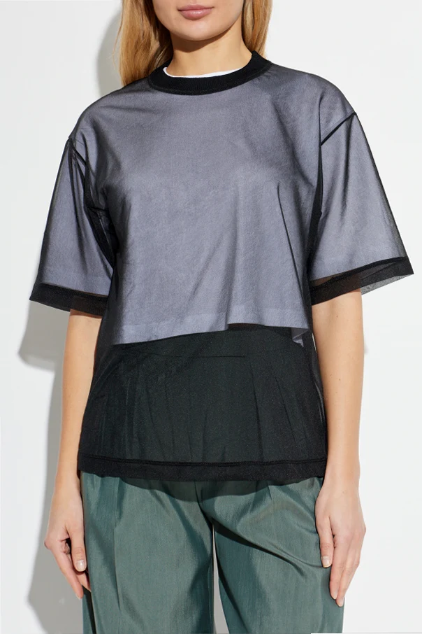 T-shirt 'Ottelia' marki Sportmax to kwintesencja współczesnej elegancji z odważnym, artystycznym zacięciem. Dominujący czarny kolor podkreśla ponadczasowy charakter i wysublimowany smak, a lekki, półtransparentny tiul otulający sylwetkę urzeka niezwykłą lekkością oraz finezyjną strukturą materiału. Swobodny fason typu oversize ze swobodnie opadającymi, krótkimi rękawami gwarantuje komfort noszenia i subtelną nonszalancję.