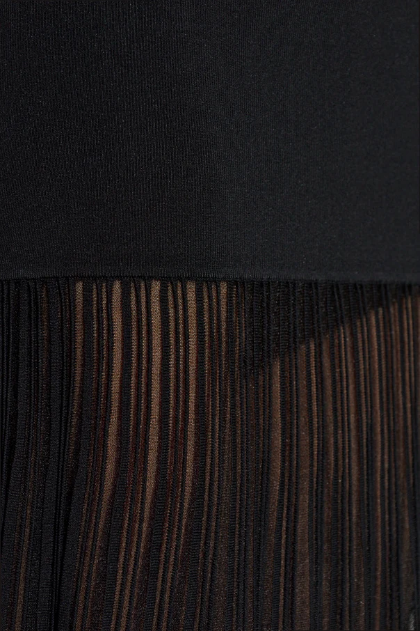 Gładka, elastyczna tkanina w górze sukienki zapewnia idealne dopasowanie, natomiast plisowany, półtransparentny dół wprowadza lekkość i finezyjny kontrast. Całość utrzymana w czarnym kolorze wyraża ponadczasową wyrafinowaną prostotę. Minimalistyczny projekt, pozbawiony jakichkolwiek wzorów czy logotypów, pozwala wyeksponować indywidualny styl oraz elegancję właścicielki.