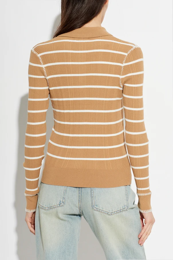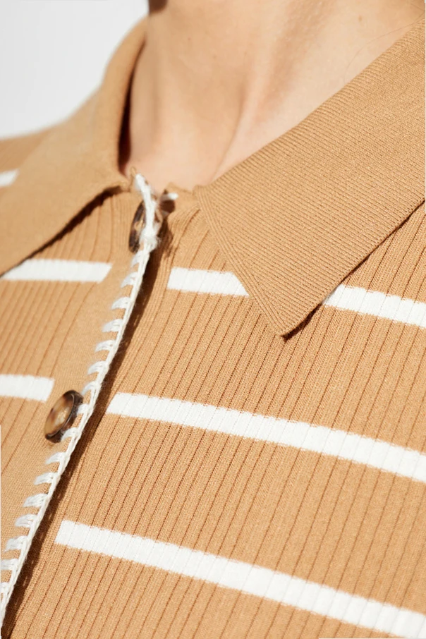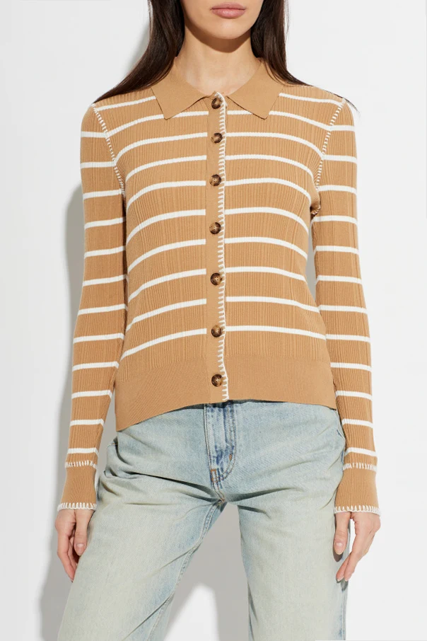 Kardigan o dopasowanym kroju marki Rag & Bone stanowi wykwintną propozycję dla koneserów ponadczasowej elegancji. Utrzymany w tonacji beżowej , z dyskretnie rozmieszczonymi poziomymi białymi paskami, subtelnie podkreśla sylwetkę dzięki lekkiej, sprężystej, prążkowanej dzianinie. Komfort noszenia zapewniają długie rękawy zakończone delikatnym ściągaczem oraz klasyczny kołnierzyk w tej samej barwie. Wzrok przyciąga wyrafinowane zapięcie na guziki o marmurkowym wykończeniu oraz dekoracyjne przeszycie z białej nici wzdłuż linii guzików. Całość wyraża lekkość i niezobowiązujący szyk – charakterystyczny dla ekskluzywnej kolekcji tej marki.