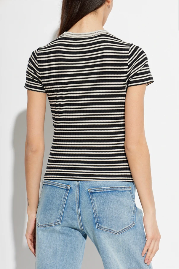 Top ze wzorem w pasy marki Rag & Bone to wyrafinowana propozycja dla miłośniczek subtelnej elegancji oraz ponadczasowego stylu. Klasyczny, lekko dopasowany fason z krótkimi rękawami i okrągłym dekoltem otulonym delikatnym ściągaczem sprawia, że jest to wybór na każdą okazję.