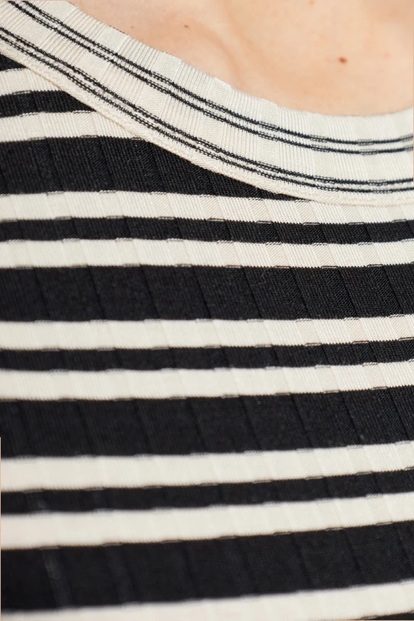 Harmonijne, poziome pasy w kolorystyce czarnej i kości słoniowej podkreślają minimalistyczny charakter projektu, a równomierna szerokość wzoru wprowadza wyjątkową równowagę i lekkość. Dzianinowy, drobno prążkowany materiał łączy w sobie niespotykaną miękkość modalu oraz elastyczność, zapewniając niezwykły komfort noszenia.