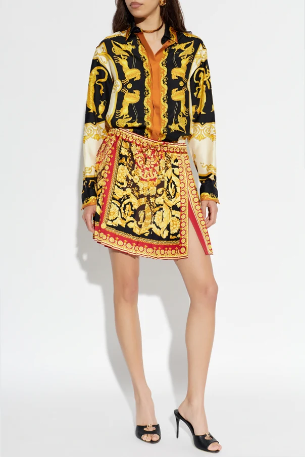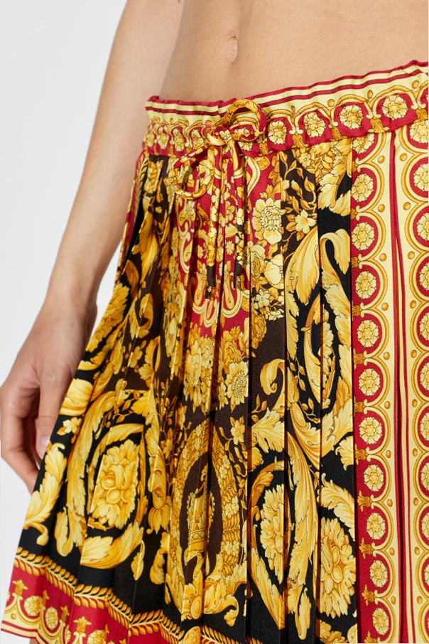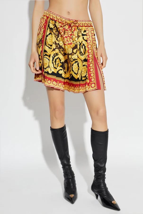 Plisowana spódnica marki Versace to uosobienie ponadczasowej elegancji i włoskiego luksusu. Krótki fason o prostym, lekko trapezowym kroju delikatnie otula sylwetkę, a całość zdobi wyraziste plisowanie, nadające objętości i subtelnego ruchu przy każdym kroku.