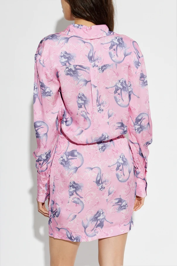 Powierzchnię sukienki zdobi intrygujący, wyrazisty nadruk z morskimi syrenkami i falami, utrzymany na różowym tle z akcentami fioletu i bieli. Całość wykonana została z wysokogatunkowej wiskozy o delikatnie satynowym połysku, zapewniając komfort noszenia oraz luksusowy wygląd. Detal przy dekolcie – subtelny paseczek z połyskującym napisem – to charakterystyczny akcent produktów premium.