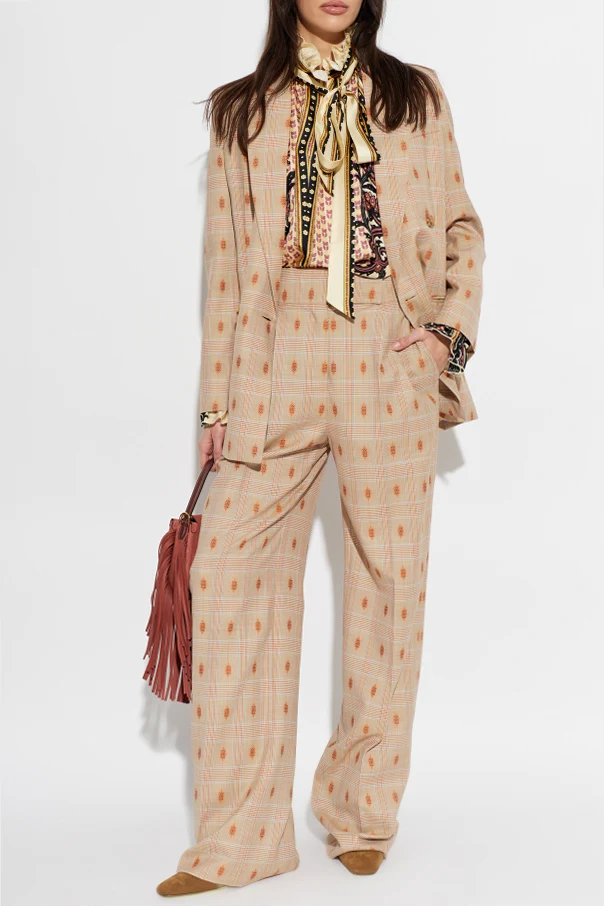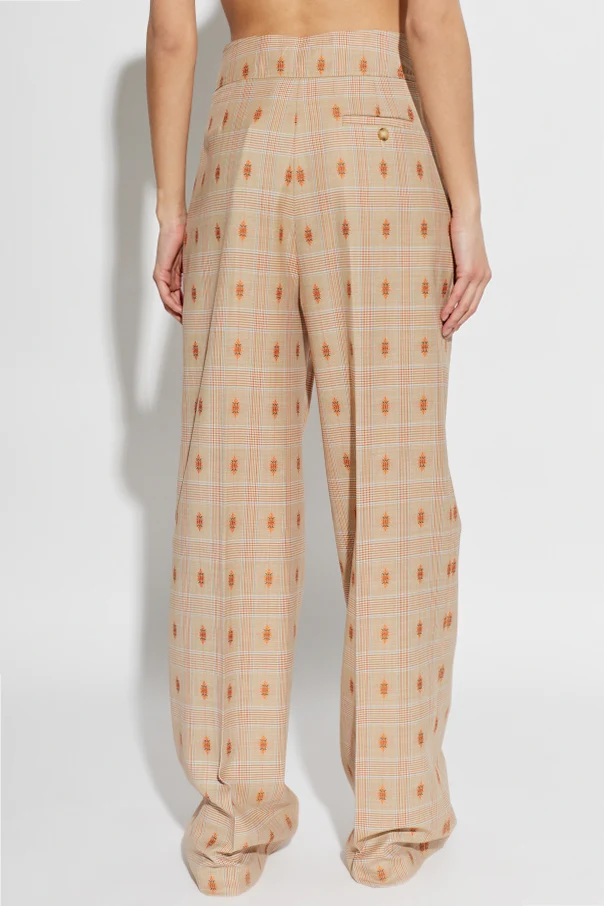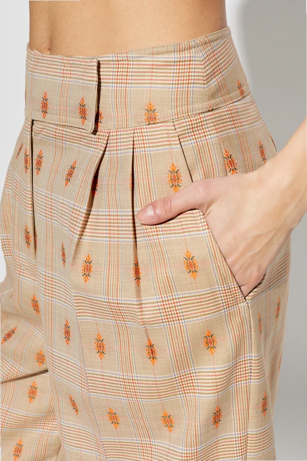 Modny, multikolorowy wzór w kratkę w stonowanych beżowo-pomarańczowych tonach zachwyca subtelnymi, haftowanymi motywami kwiatowymi oraz geometrycznymi akcentami w odcieniu pomarańczowym. Wysoki stan oraz przemyślane zaszewki z przodu harmonijnie podkreślają talię i nadają sylwetce wyszukany kształt. Szerokie, modelujące nogawki z dopracowanymi bocznymi szwami tworzą niezwykle efektowną linię.