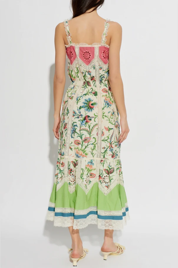 Całość zdobi kontrastujący różowy panel z ażurowym haftem przy dekolcie oraz szerokie ramiączka, ozdobione misternymi przeszyciami. Ta wyjątkowa sukienka wpisuje się w kanon luksusowej elegancji – dla kobiet ceniących ponadczasowy styl w wersji MULTIKOLOR.