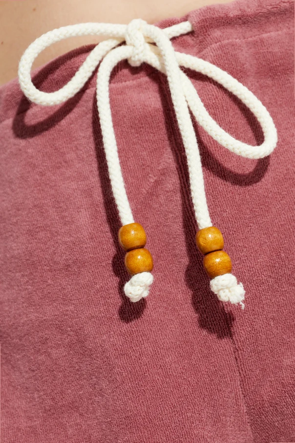 Klasyczna forma z lekko rozszerzaną nogawką i wyraźnie zaznaczoną talią emanuje lekkością i komfortem. Elastyczny pas ze ściągaczem, ozdobiony białym, sznurkowym troczkiem, zapewnia doskonałe dopasowanie, a drobne, drewnopodobne koraliki na końcach sznurków dodają szczypty wyrafinowania. Szwy pozostają niewidoczne, a całość zachwyca czystą formą pozbawioną zbędnych zdobień.