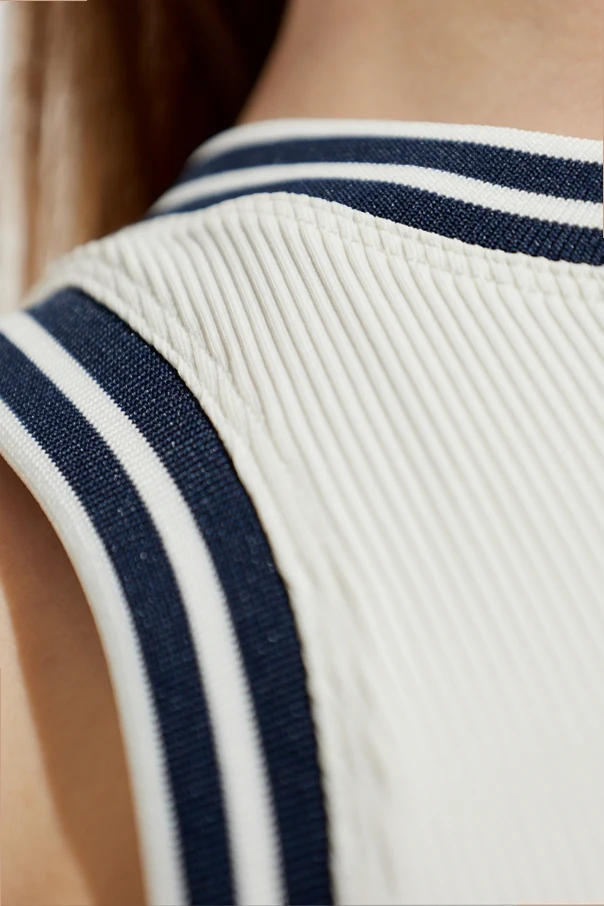 Ekskluzywności dodają szerokie, kontrastowe lamówki w granatowym odcieniu z finezyjnymi dwoma białymi liniami na brzegach, które stanowią wyjątkowy akcent stylistyczny. Wyselekcjonowane tkaniny gwarantują elastyczność oraz komfort użytkowania, czyniąc top idealnym wyborem do aktywności fizycznej i codziennych stylizacji.