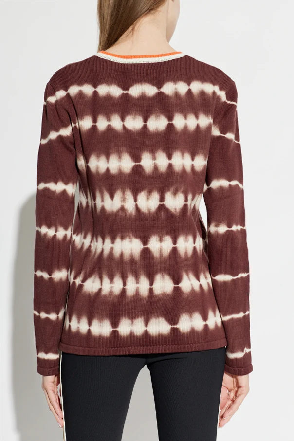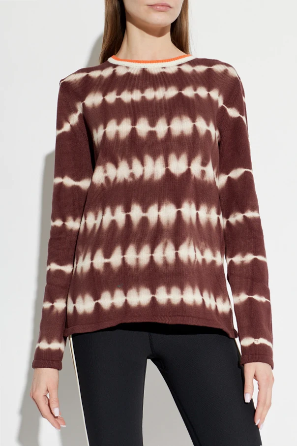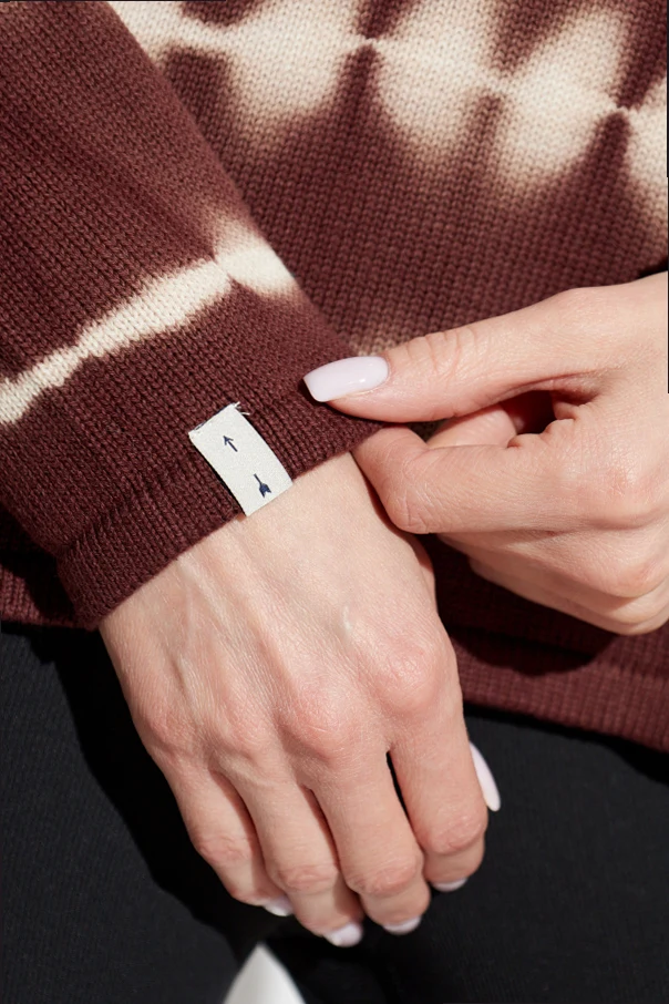 Wyrazisty wzór tie-dye w poziome pasy harmonijnie zestawia dominujący brązowy ton z kremowobiałymi akcentami, tworząc niezwykle efektowny, artystyczny charakter oraz przywodząc na myśl łagodne, nieregularne „chmurki”. Zastosowana dzianina z wysokogatunkowej bawełny cechuje się wyrazistą, drobną strukturą, gwarantującą wyjątkową miękkość i trwałość.