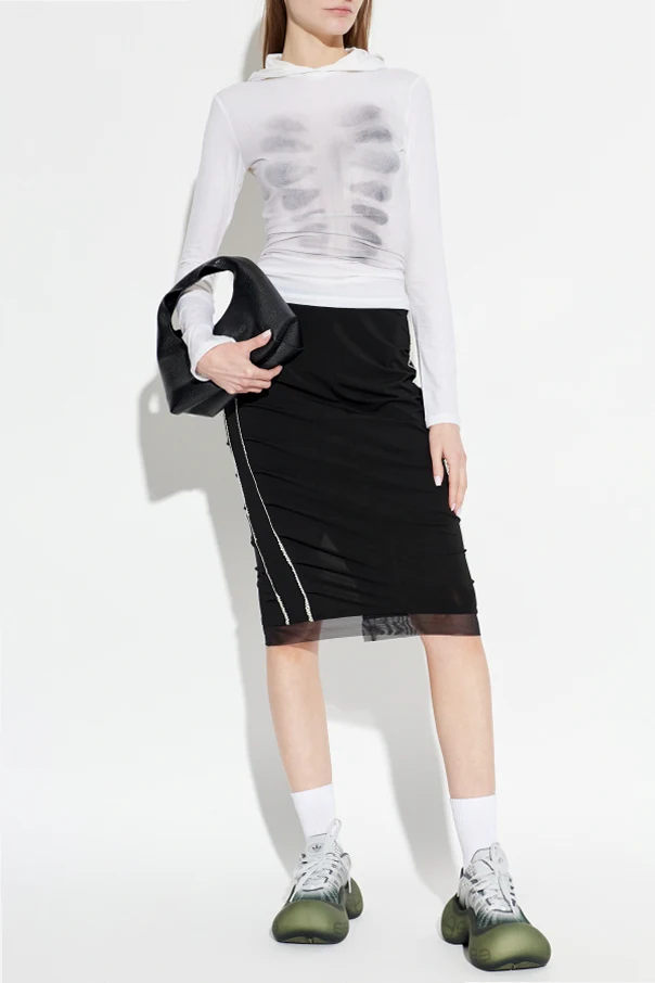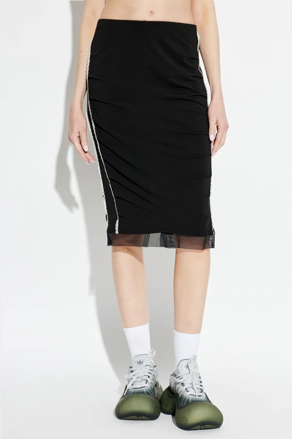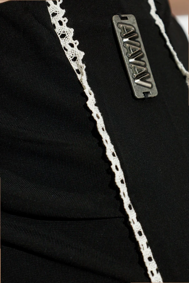 Jednolity czarny ton harmonijnie przełamują ozdobne, białe ażurowe lamówki wzdłuż boków, dyskretnie wydłużając optycznie sylwetkę. Dół wieńczy niezwykle efektowna, półprzezroczysta wstawka z delikatnej siateczki w kolorze czarnym, oferując współczesny akcent i wyróżniający detal. To wyrafinowane połączenie klasyki z nowoczesnością, sygnowane przez projektanta AVAVAV.