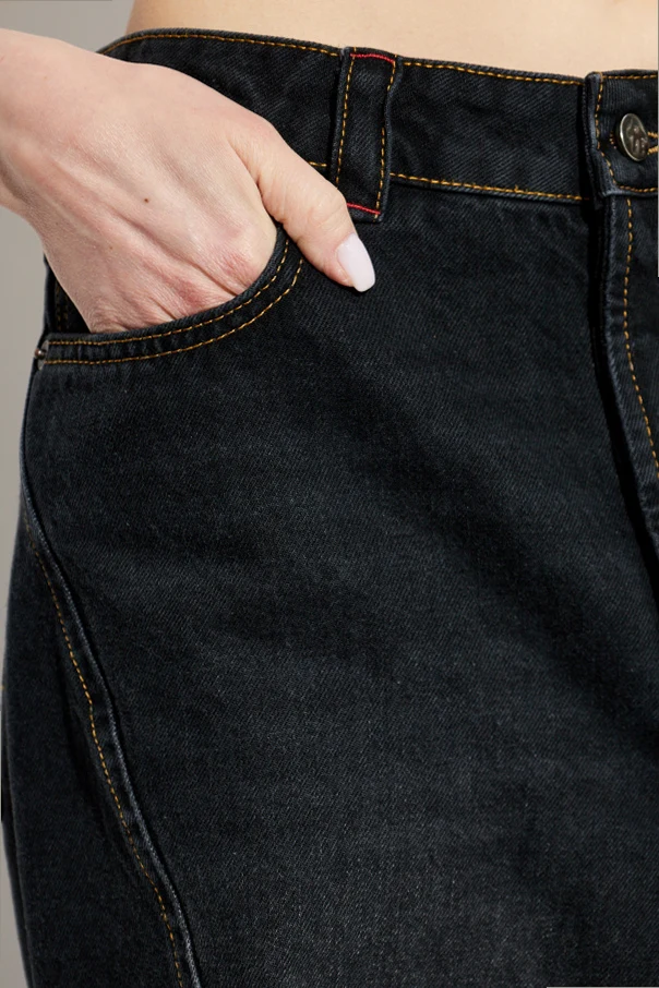 Wykonane z klasycznego, sztywnego denimu z czystej bawełny, gwarantują stabilność formy oraz trwałość. Subtelne, żółto-pomarańczowe przeszycia, podkreślające linię kieszeni, szwy boczne i wykończenie pasa, wprowadzają unikatowy kontrast oraz podbijają ponadczasowy charakter spodni.
