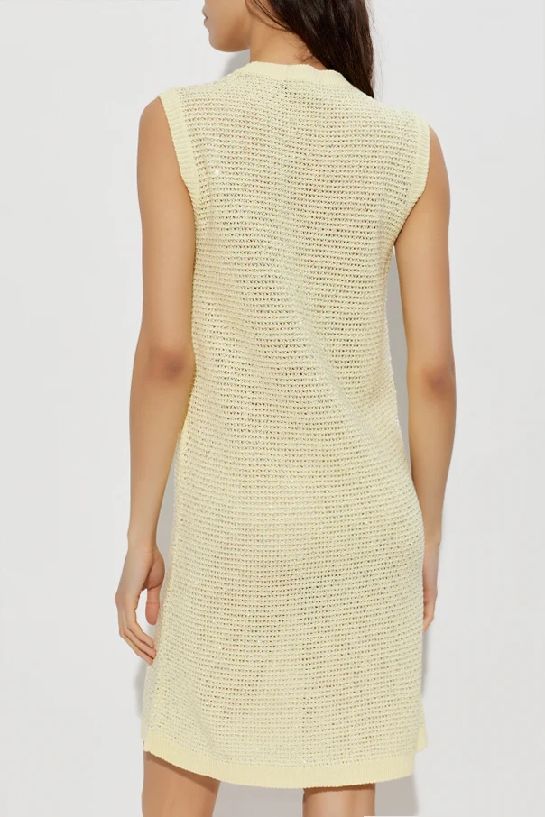 Sukienka powstała z miękkiej, żółtej dzianiny o wyraźnie ażurowym splocie, który przywodzi na myśl rękodzieło najwyższej próby. Jej jednolitą strukturę wzbogacają starannie rozmieszczone cekiny, nadające subtelny blask i artystyczny kunszt, doskonały na szczególne okazje. Delikatne obszycia dekoltu i przyramków podkreślają precyzję ręcznej pracy charakterystycznej dla kolekcji Fabiana Filippi.