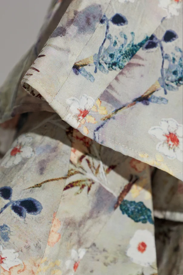 Urok sukienki stanowi wielokolorowy, artystyczny nadruk florystyczny – nieregularnie rozmieszczone elementy kwiatowe oraz roślinne w tonacjach niebieskich, brązowych, zielonych, żółtych i pomarańczowych, rozświetlone jasnym, stonowanym tłem. Wyrafinowany charakter podkreśla lekka, przewiewna tkanina o półmatowej fakturze, harmonijnie łącząca wiskozę z poliamidem, oferująca komfort noszenia nawet w najbardziej wymagających warunkach.