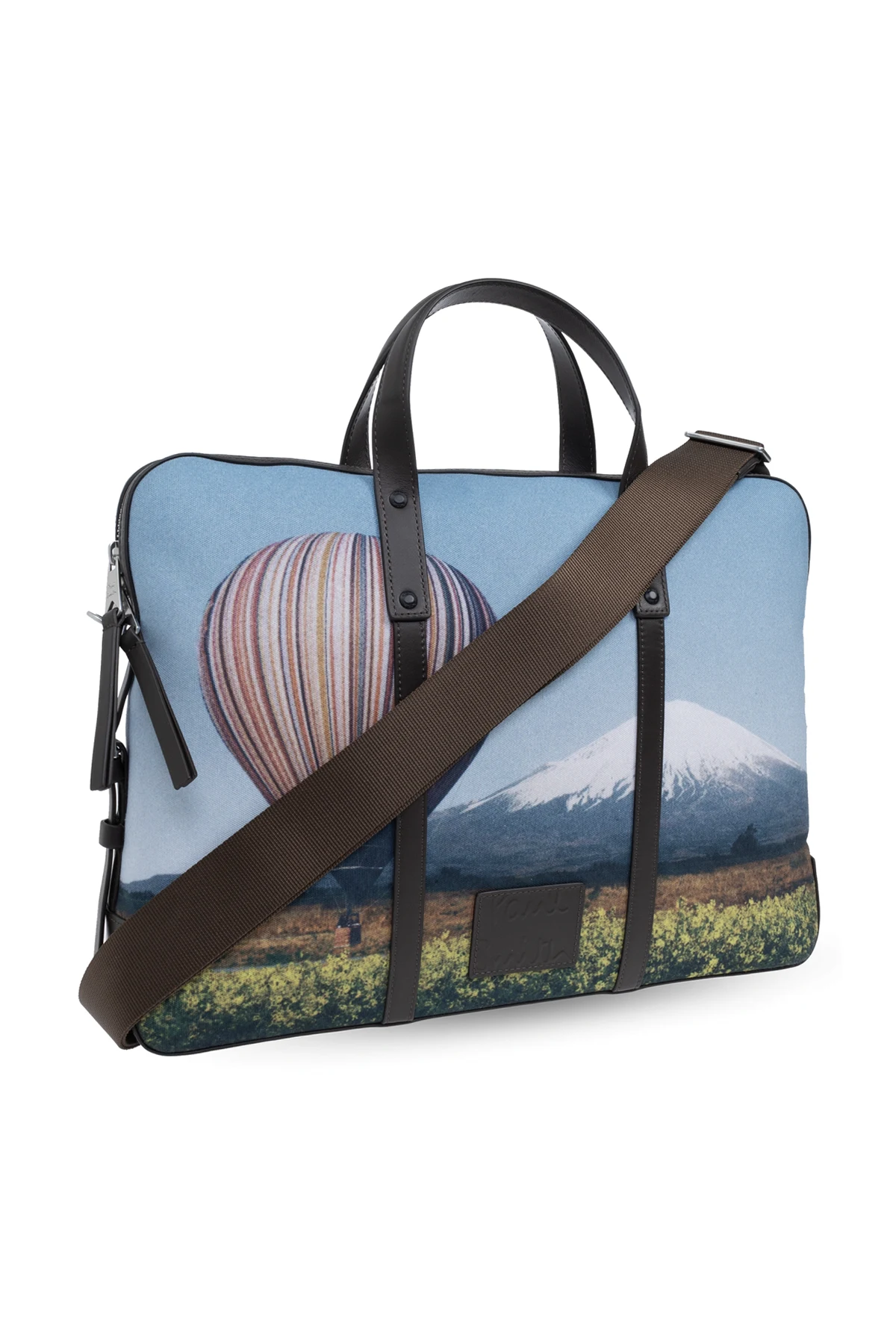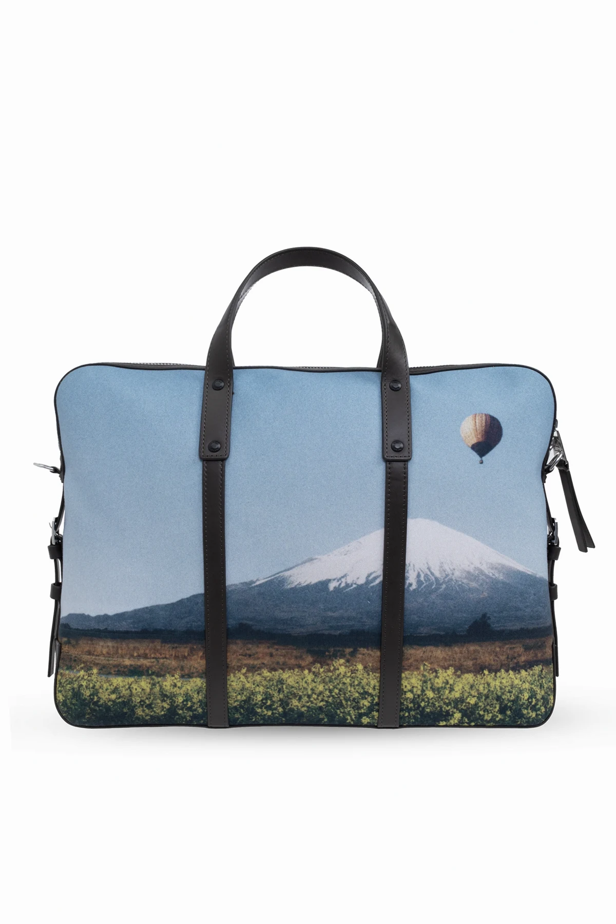 Unikatowy nadruk przedstawiający malowniczy krajobraz z majestatyczną górą i żywiołowym polem kwiatów, przez które przemierza kolorowy balon na gorące powietrze, nadaje tej aktówce niepowtarzalny charakter. Błękit tła oraz wielobarwne pasy balonu harmonizują z naturalnymi odcieniami zieleni, żółci, czerwieni i bieli, tworząc dzieło sztuki noszone na co dzień.