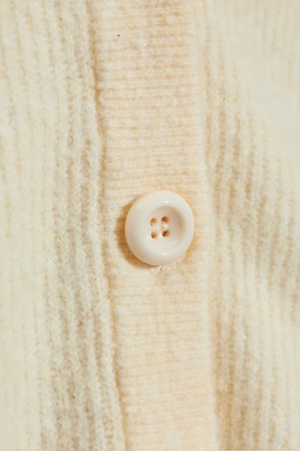Kremowy kardigan zapinany jest na pięć subtelnych, czterodziurkowych guzików, które harmonijnie dopełniają całość. Luksusowy materiał o wyczuwalnej, szlachetnej fakturze – to elegancka mieszanka najwyższej jakości włókien, gwarantujących miękkość i przyjemność użytkowania. Brak zbędnych ozdobników wydobywa czystość formy, pozwalając docenić wyrafinowaną prostotę fasonu.