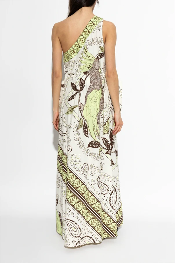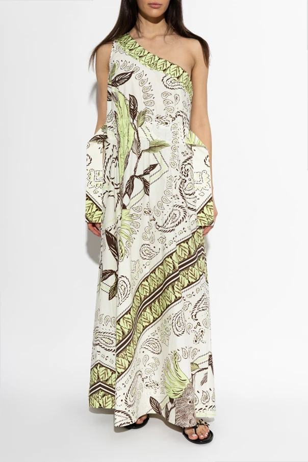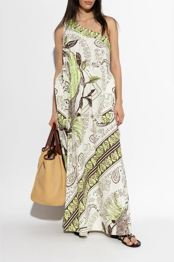 Sukienka na jedno ramię marki Tory Burch to esencja wyrafinowanego smaku, przeznaczona dla kobiet ceniących subtelną oryginalność. Długa, sięgająca kostek, o swobodnym, lekko rozkloszowanym kroju, zachwyca pojedynczym, asymetrycznym dekoltem. Brzeg dekoltu zdobi dekoracyjny pas materiału z akcentem zielonym oraz motywem liści, który zjawiskowo podkreśla formę sukni.