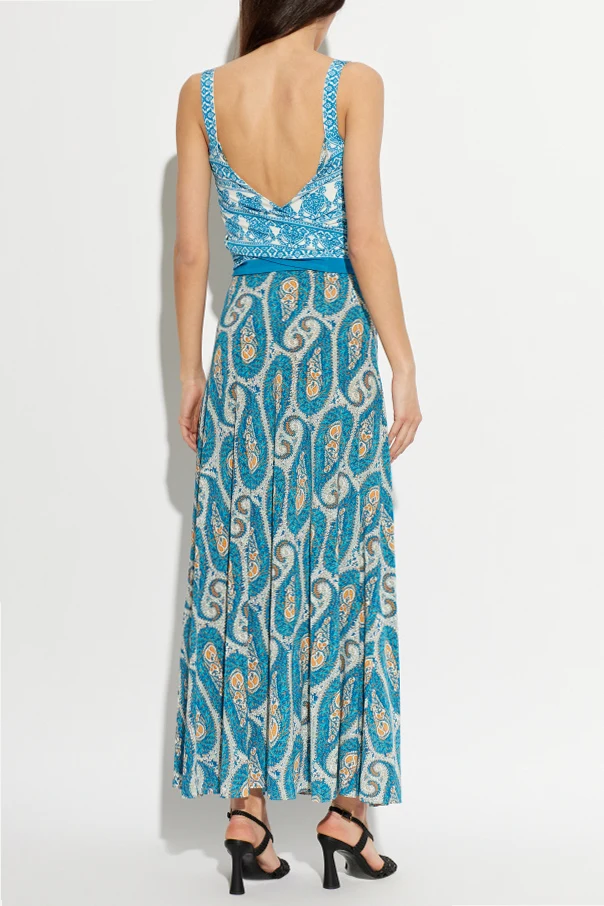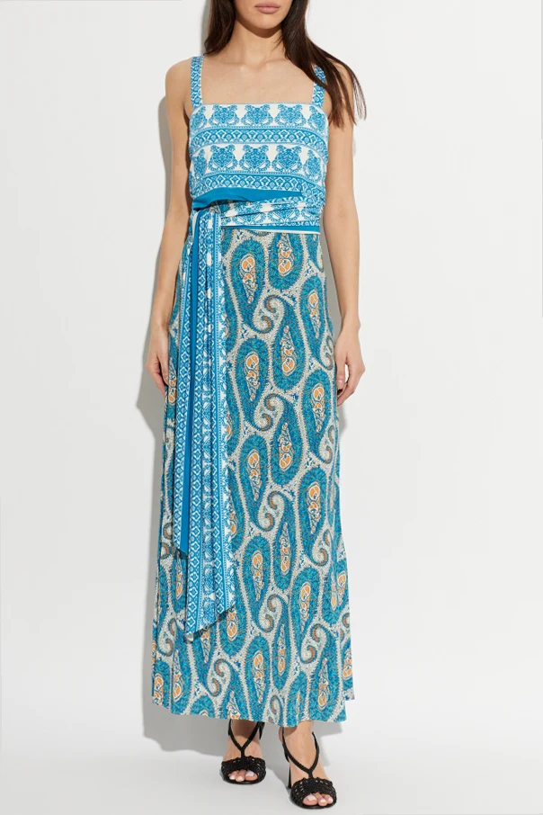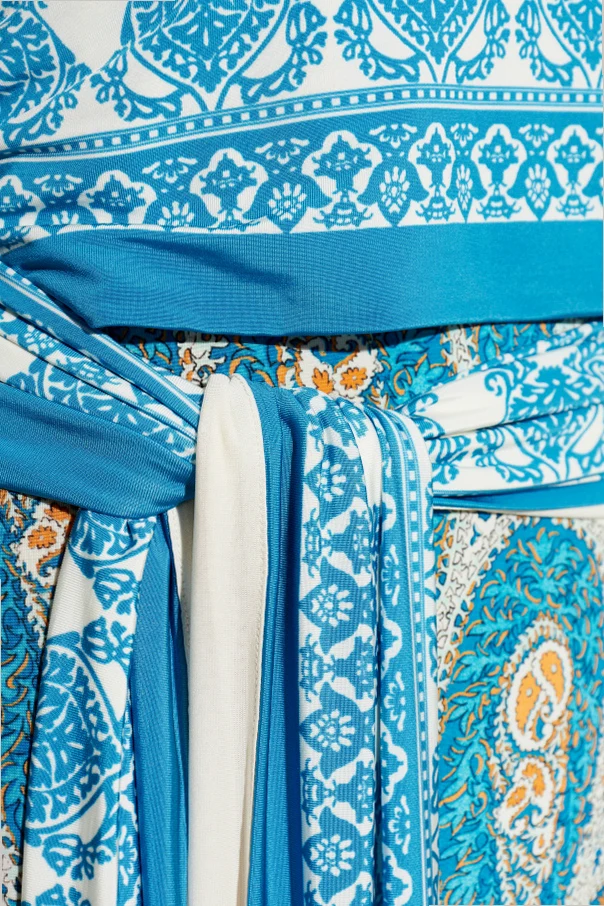 Wzorzysta sukienka z dekoracyjnym szalem to propozycja dla koneserek wyrafinowanego stylu, które cenią subtelność detalu i ponadczasowy wdzięk. Zaprojektowana przez Etro , zjawiskowa sukienka o długości maxi zachwyca nie tylko niebieskim odcieniem, lecz także przemyślanym fasonem na szerokich ramiączkach oraz prostym, kwadratowym dekoltem z przodu i głębokim wycięciem na plecach.