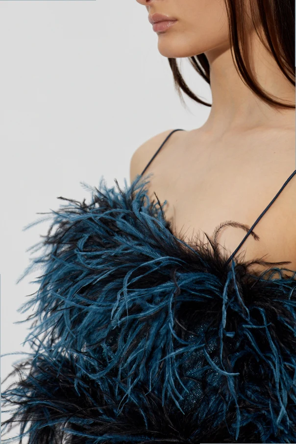 Sukienka ze strusimi piórami marki Oséree to wyraz szlachetnej ekstrawagancji oraz finezyjnej lekkości. Jej krótki, prosty krój mini o subtelnie luźnej linii harmonijnie współgra z niezwykłym bogactwem tekstur, jakie zapewniają starannie rozmieszczone warstwowo strusie pióra w kolorze granatowym .