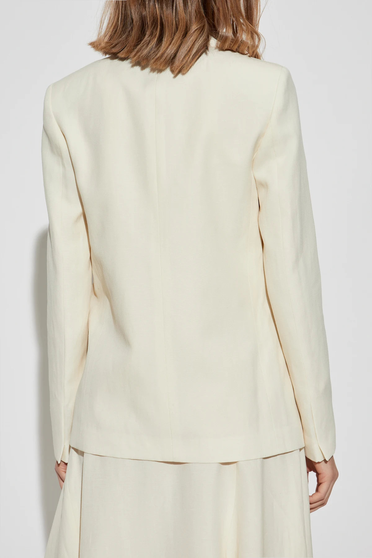 Odkryj kremową marynarkę z ekskluzywnej kolekcji Fabiany Filippi , która stanowi kwintesencję włoskiej elegancji i rzemieślniczej doskonałości. Jej klasyczny krój z prostymi liniami i jednorzędowym zapięciem na jeden guzik podkreśla subtelność i klasę tego wyjątkowego projektu.