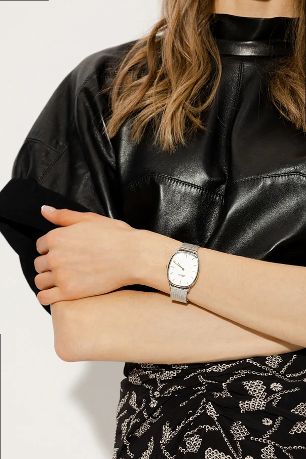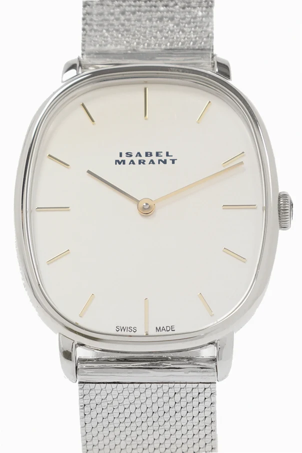 Zegarek w kolorze srebrnym Isabel Marant. Wykonany ze stali nierdzewnej. Dołączony czarny, skórzany pasek z możliwością regulacji długości. Kwadratowa tarcza w kolorze złotym z nadrukiem z logo.