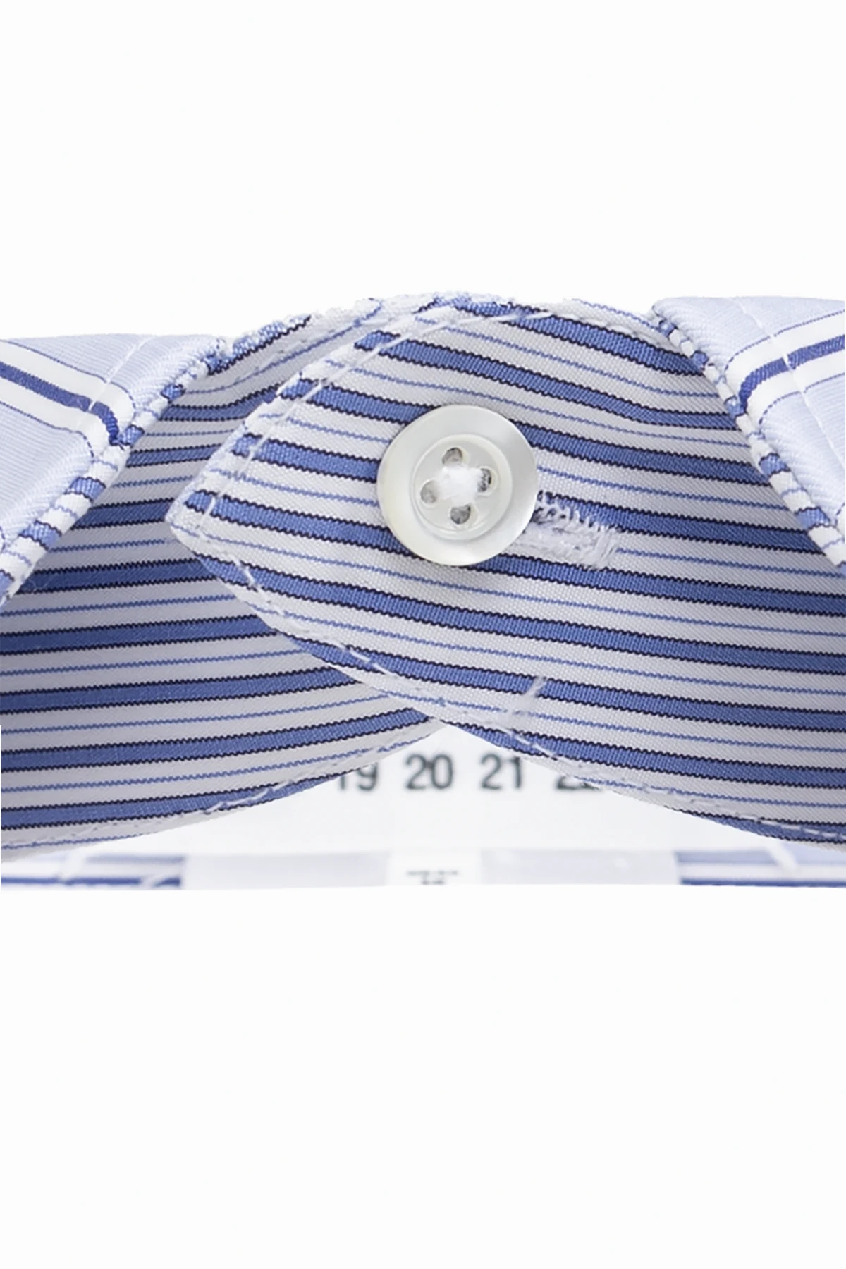 Charakterystyczny, klasyczny, spiczasty kształt kołnierzyka, ozdobiony eleganckim wzorem w niebieskie pasy na jasnym tle, stanowi idealne połączenie tradycji z nowoczesnością. Białe, symetrycznie rozmieszczone guziki dodają całości formalnego wyrazu, a jednocześnie umożliwiają szybkie i wygodne zapinanie. To doskonały wybór dla osób poszukujących sposobu na szybką zmianę wyglądu bez konieczności zakładania pełnej koszuli.