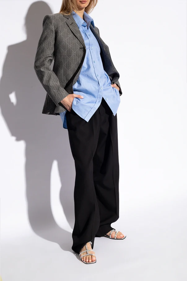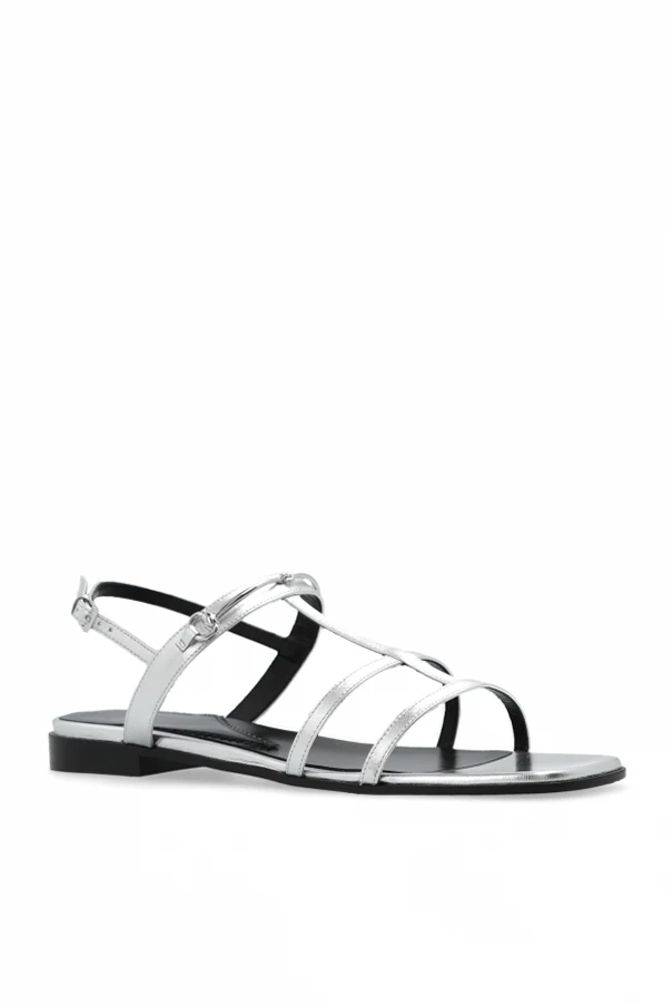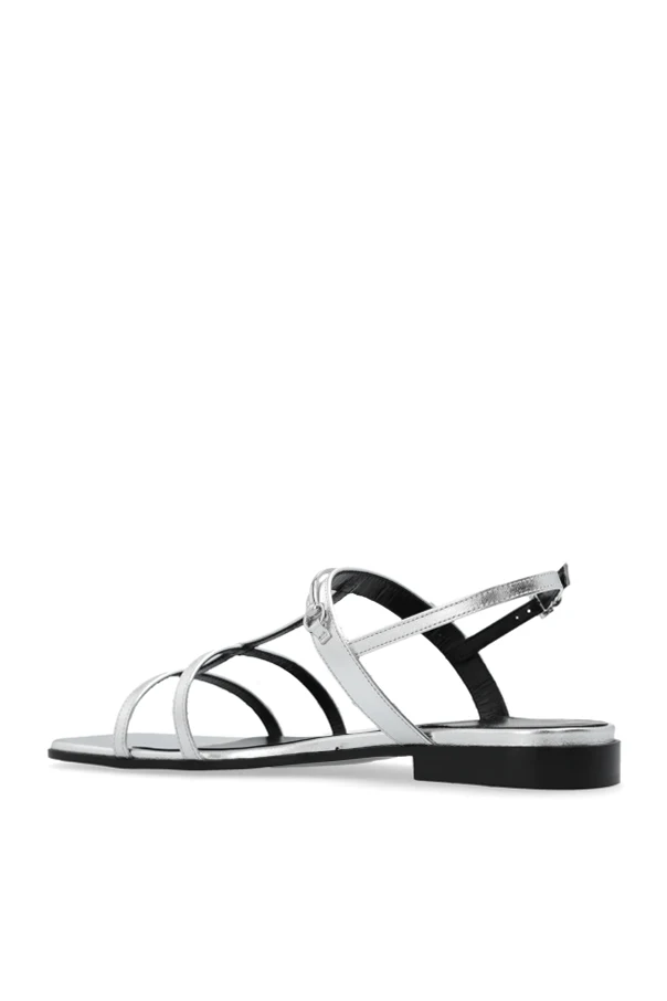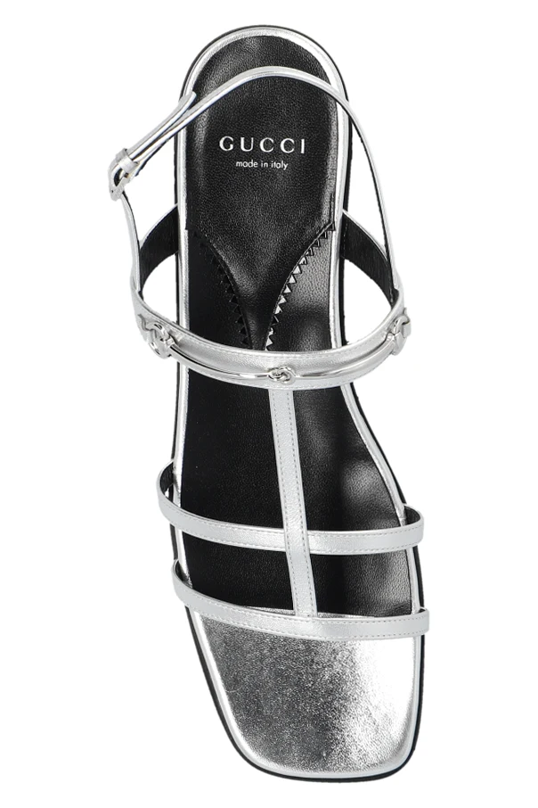 Skórzane sandały w kolorze srebrnym Gucci. Zapinane na regulowany pasek z klamrą. Z przodu ozdobione metalową aplikacją w kształcie charakterystycznego wędzidła. Kwadratowy, lekko ścięty nosek. Czarna, skórzana podeszwa.