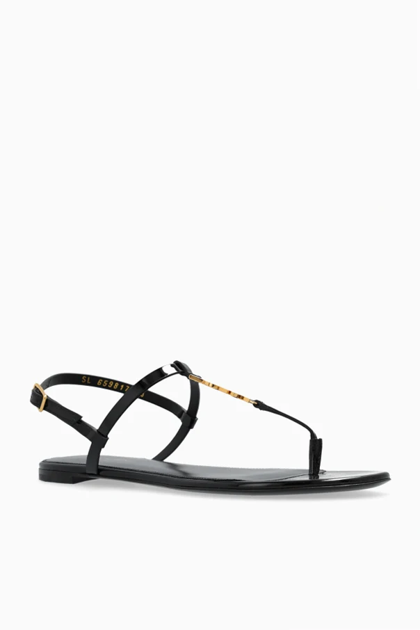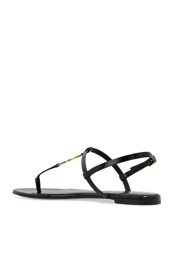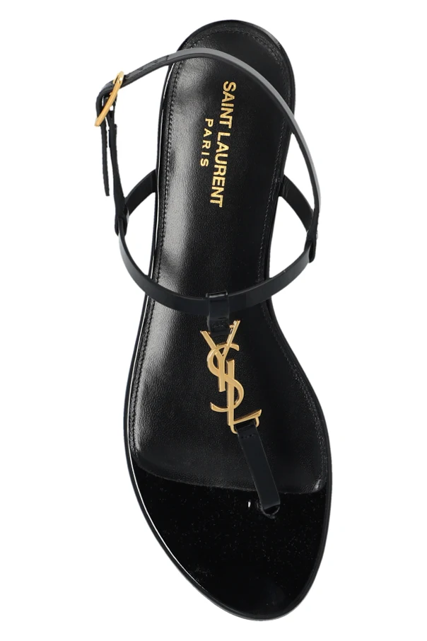 Czarne sandały, model ‘Cassandra’ Saint Laurent. Wykonane z lakierowanej skóry. Zapinane wokół kostki na regulowany pasek z klamrą. Z przodu aplikacja w kształcie logo w kolorze złotym. Czarna, skórzana podeszwa.