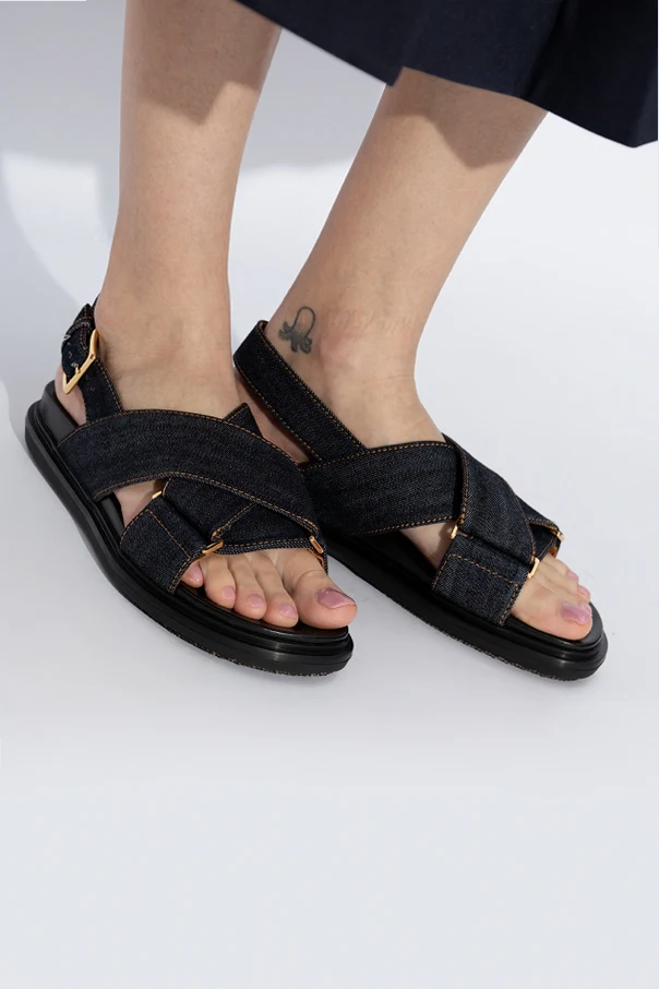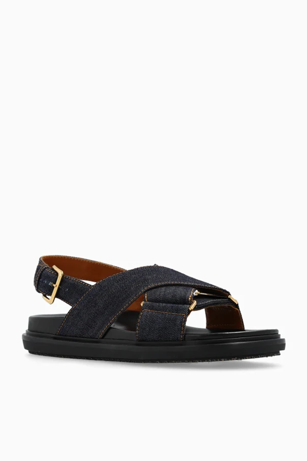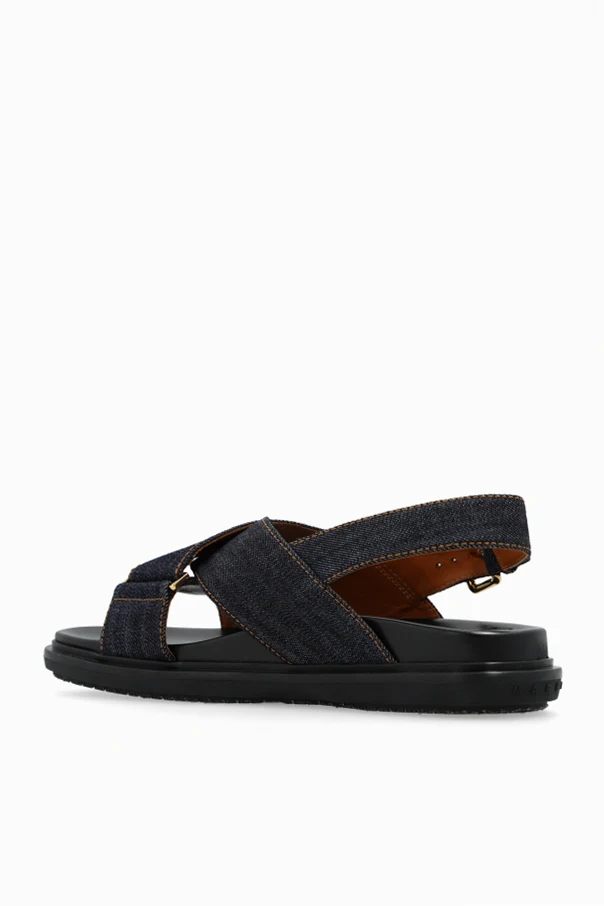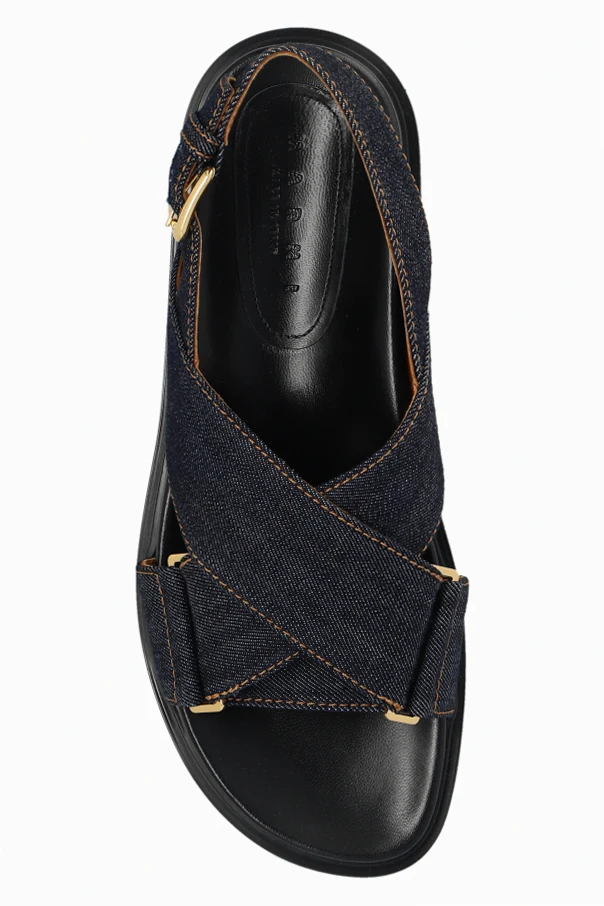 Granatowe sandały, model ‘Fussbett’ Marni. Wykonane z jeansu. Zapinane na rzepy. Z tyłu ozdobione wypukłym logo. Czarna, gumowa podeszwa wykończona jutą.