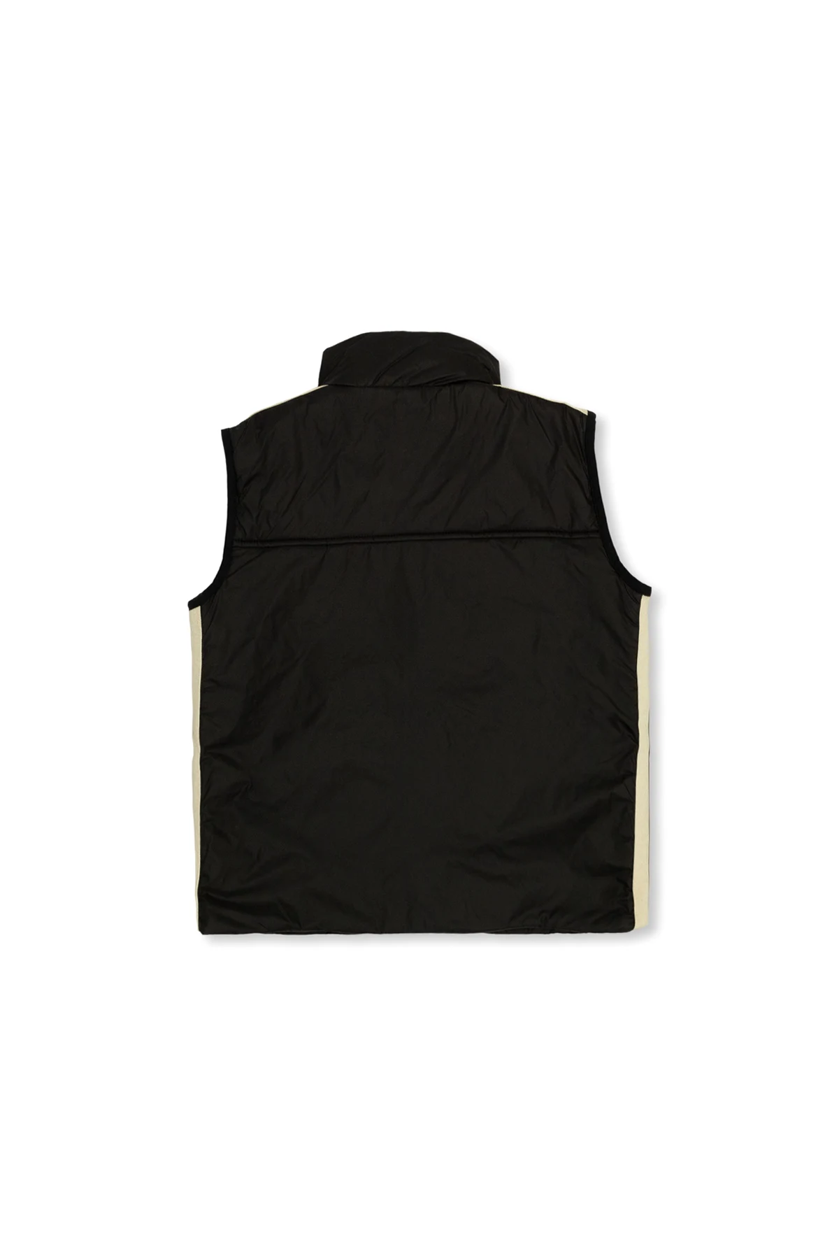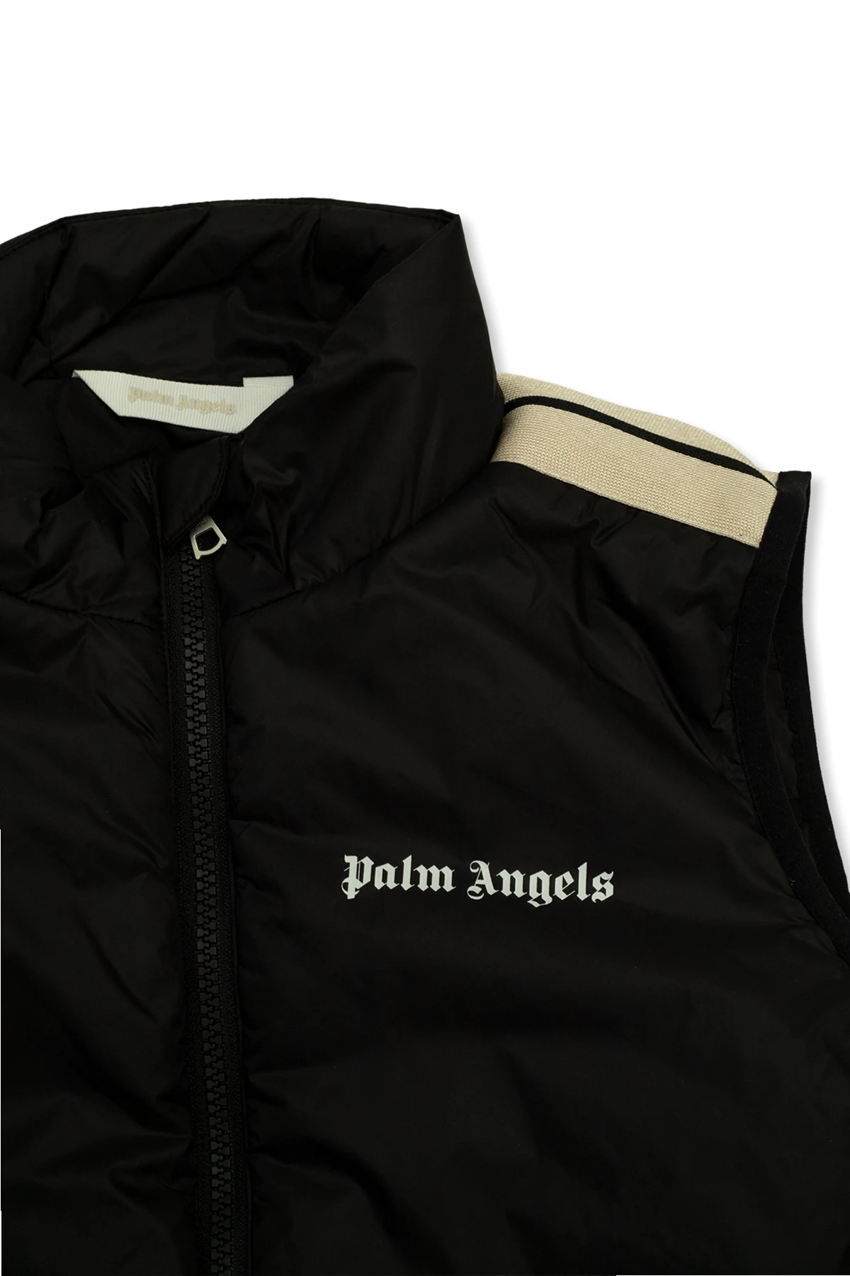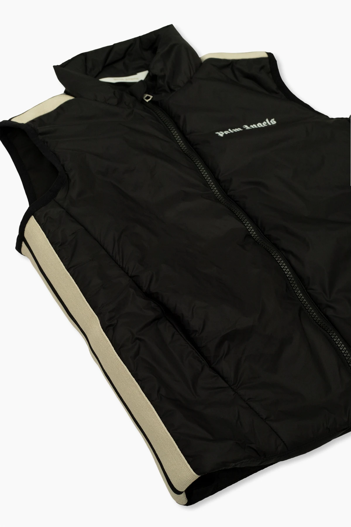 Czarno-kremowa kamizelka ze stójką Palm Angels. Zapinana na zamek. Ozdobiona nadrukowanym białym logo. Z przodu dwie kieszenie. Puchowe wypełnienie.