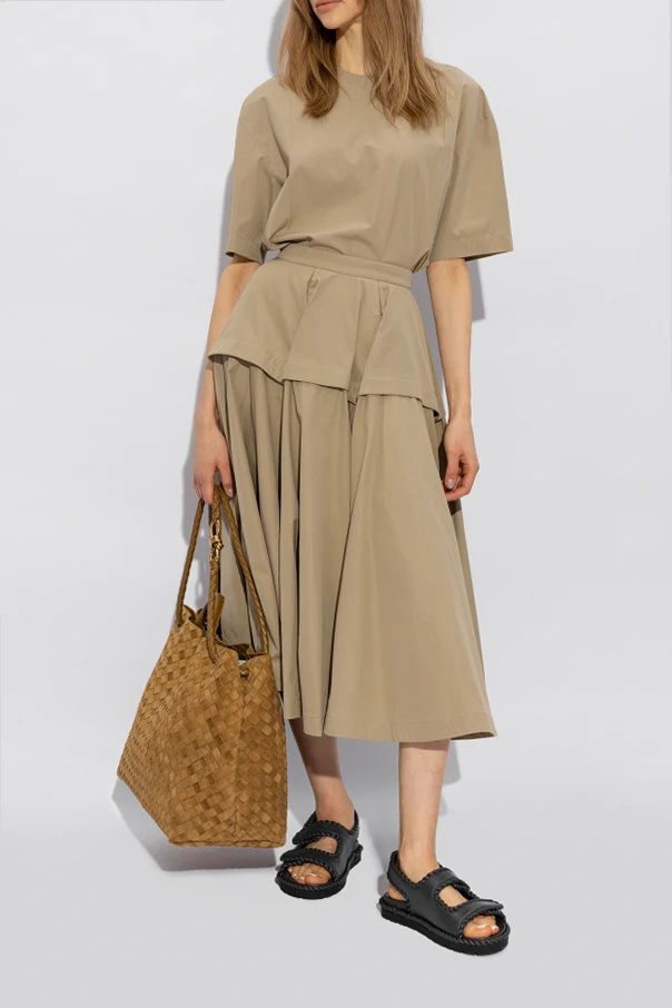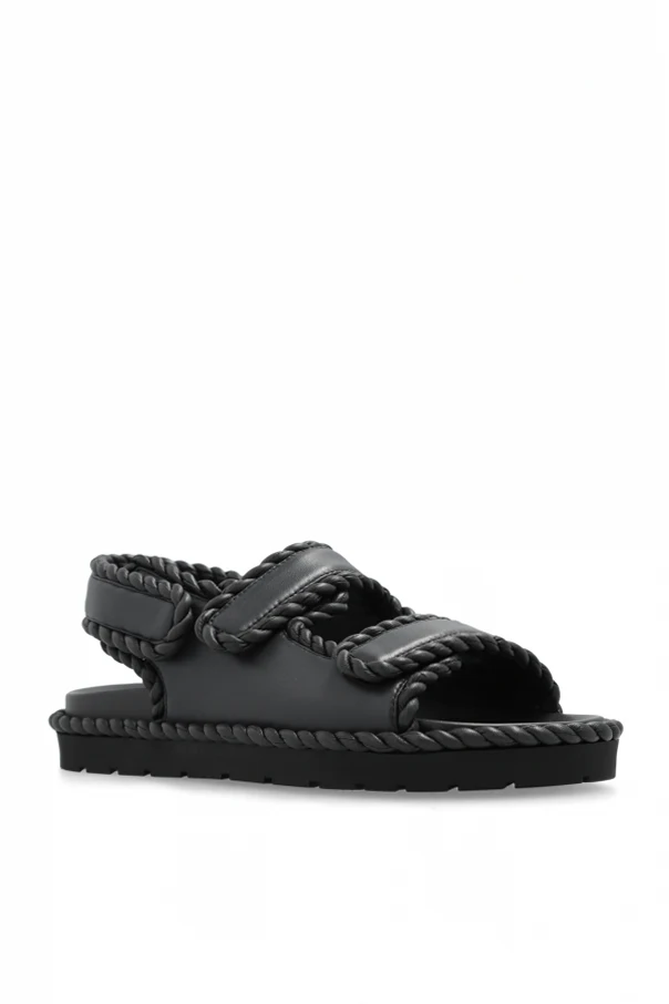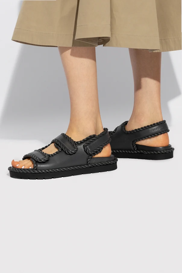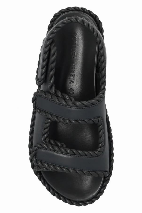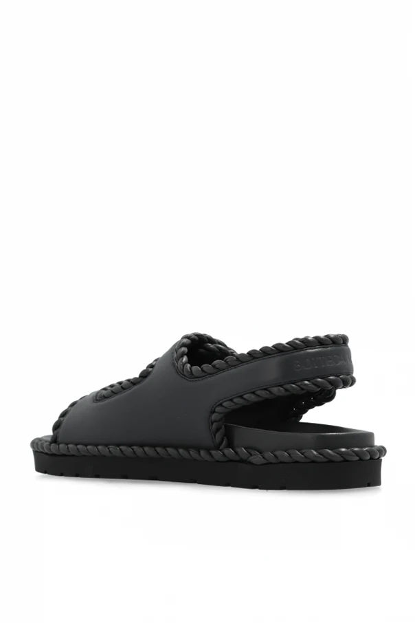 Ciemnoszare sandały, model ‘Jack’ Bottega Veneta. Wykonane z jagnięcej skóry. Zapinane na paski z rzepem. Dekoracyjna lamówka typu ‘torchon’. Czarna, gumowa podeszwa.