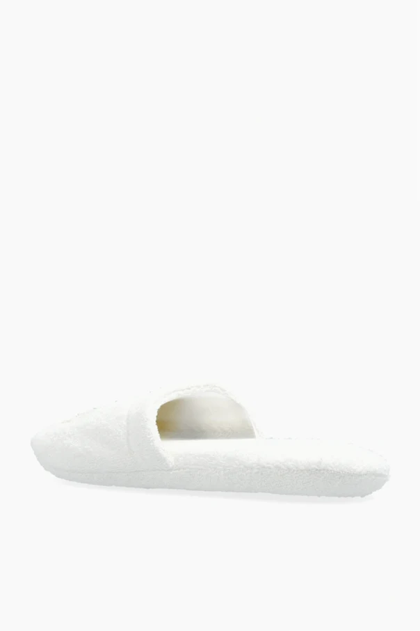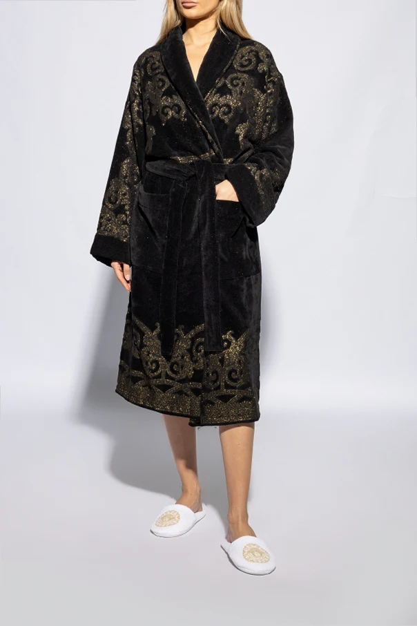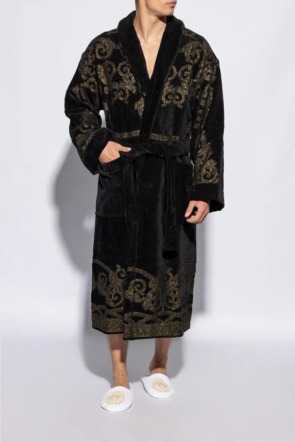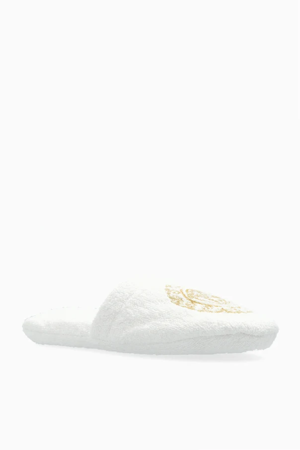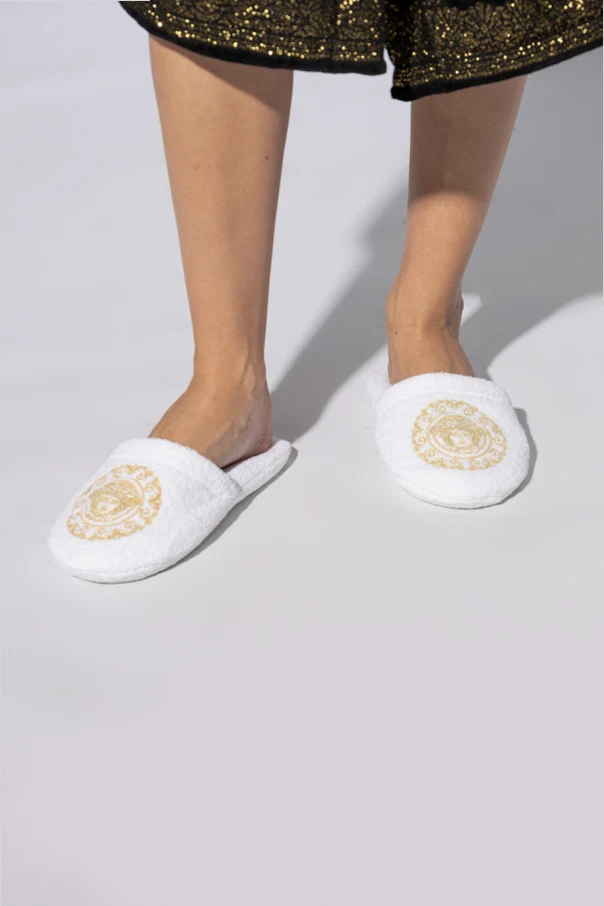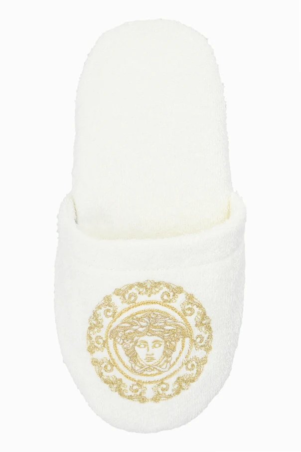 Zachwycają swym nieprzemijającym urokiem oraz subtelną elegancją, kapcie z logo Versace Home są kwintesencją domowego luksusu. Ich nieskazitelnie biały odcień, przełamany jedynie złotymi zdobieniami logo, przypominającymi klasyczne motywy dekoracyjne, dodaje im wyrafinowania. Wykonane z najwyższej jakości materiału typu frotte, z domieszką lnu i bawełny, zapewniają niezrównany komfort i miękkość, sprawiając, że każdy krok staje się przyjemnością.