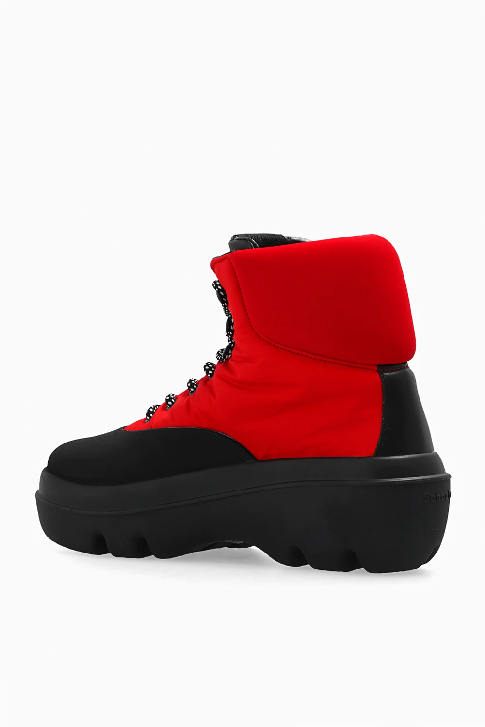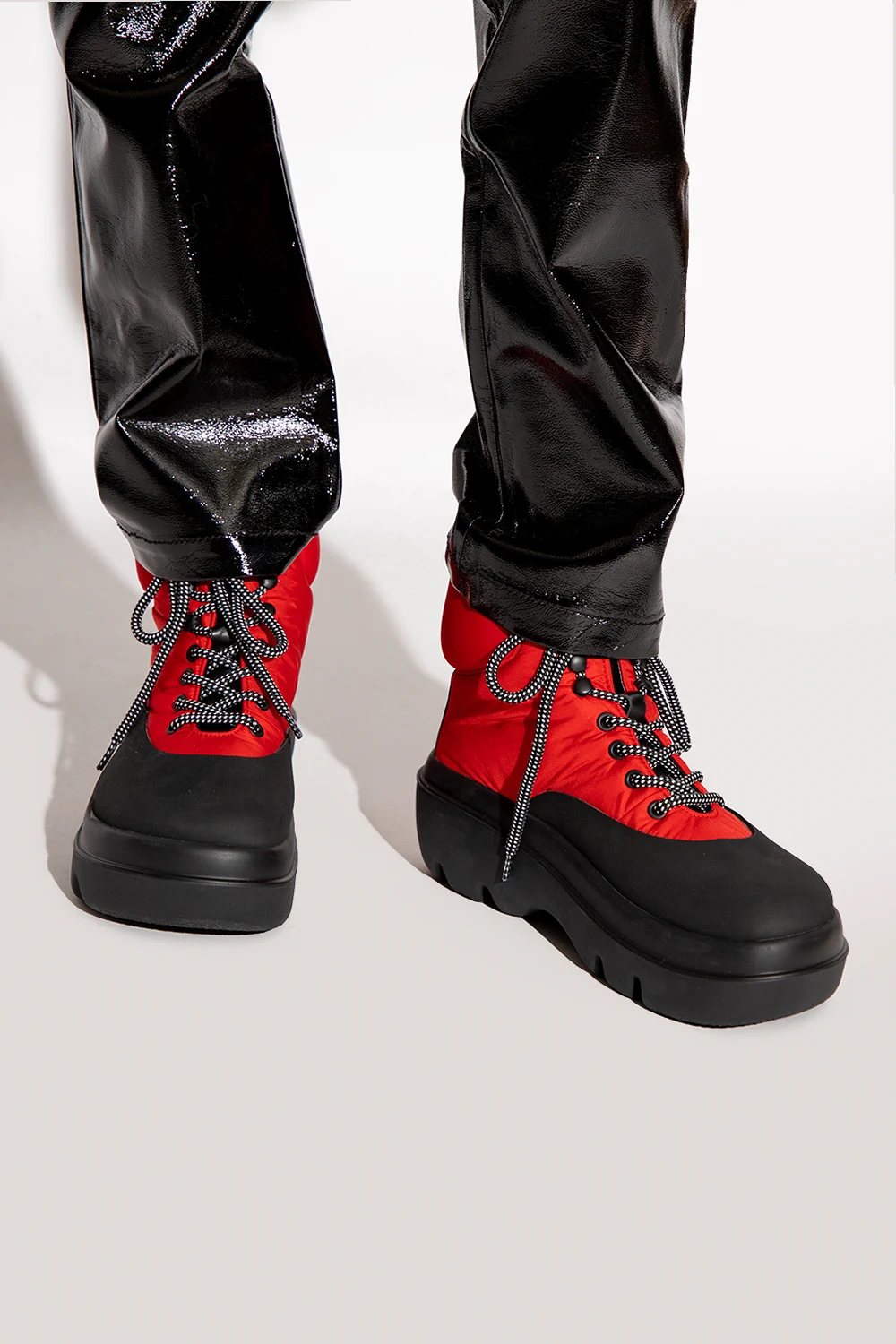 Czerwono-czarne, sznurowane śniegowce Proenza Schouler. Wykończone gumą. Na języku oraz z tyłu ozdobione logo. Czarna, gumowa podeszwa.